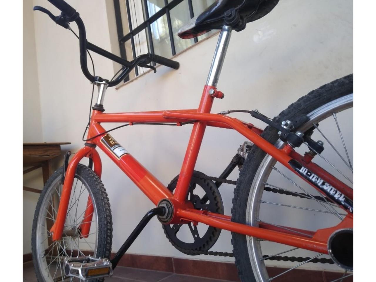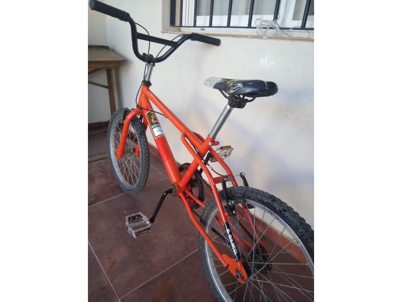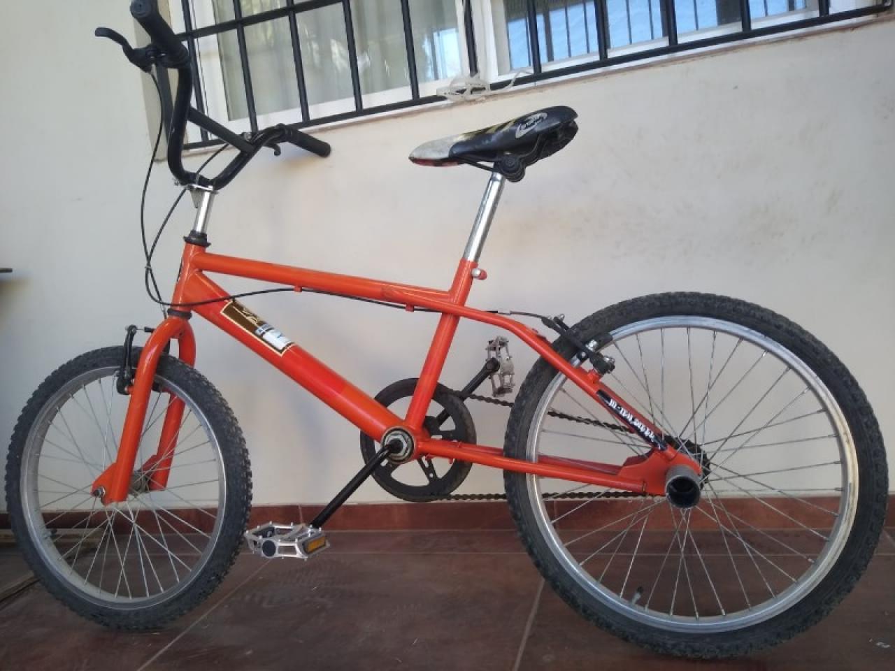 Bicicleta BMX roja, rodado 20, frenos mecánicos delanteros y traseros desmontables, pedales de aluminio nuevos, cámaras nuevas.