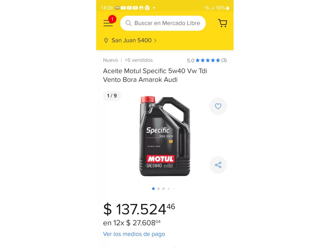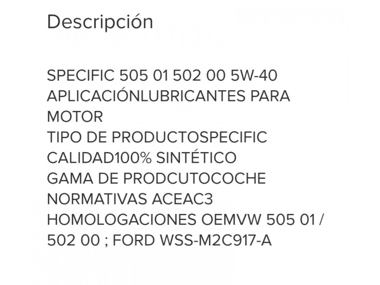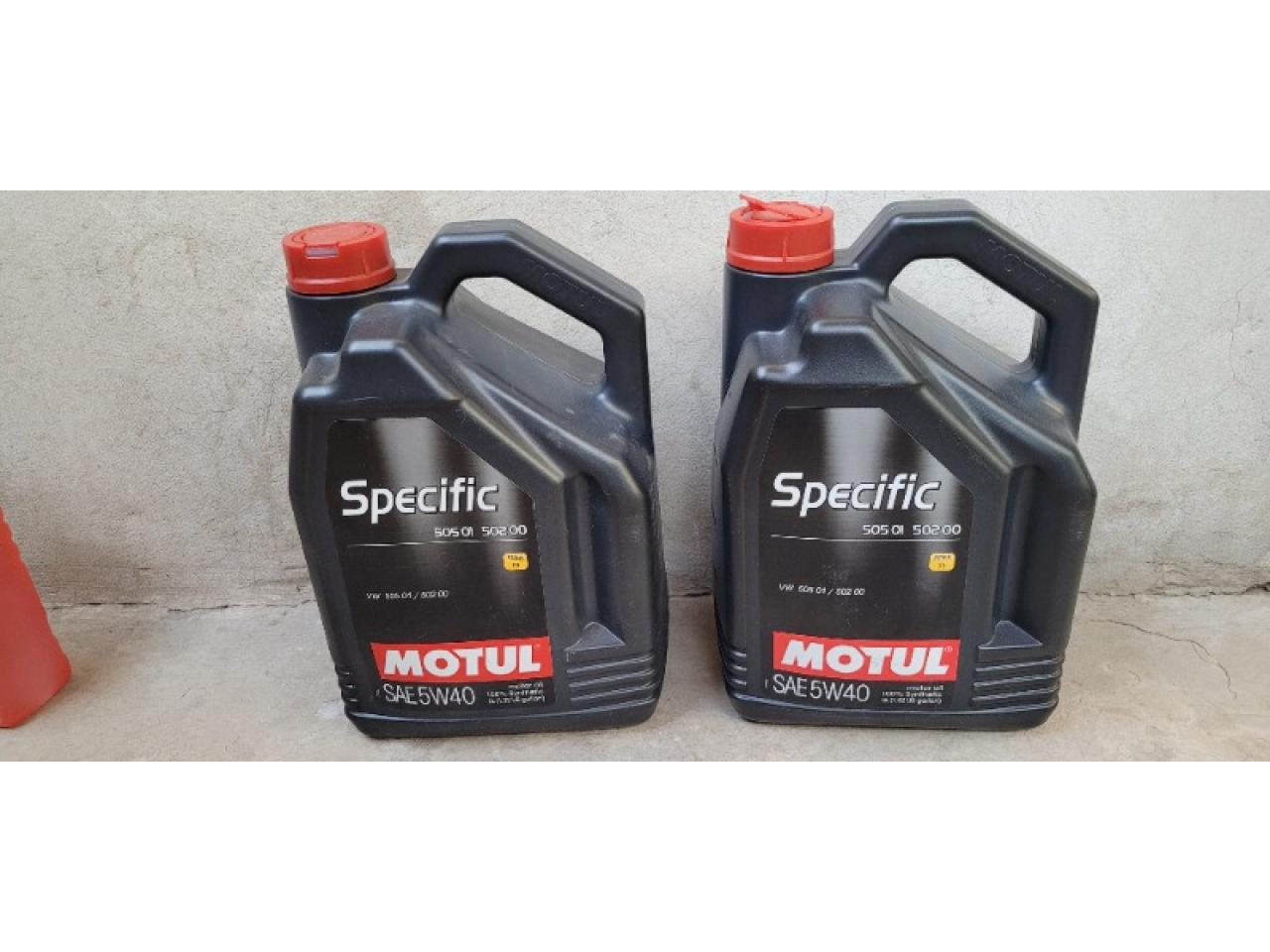 9 litros de aceite sintético Motul Specific SAE 5w40, un bidón cerrado con 5 litros y un bidón que le faltan 700 cm3 . Me sobraron por poner en venta VW Tuareg.