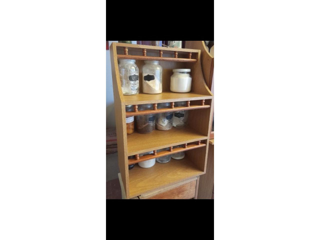 Hermoso mueble de alacena para colgar, con estantes y barrales dd cedro torneados