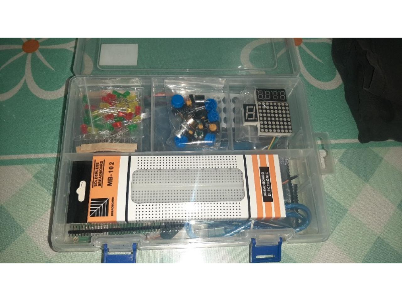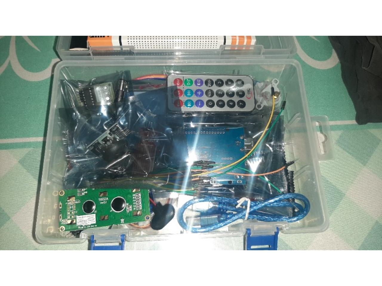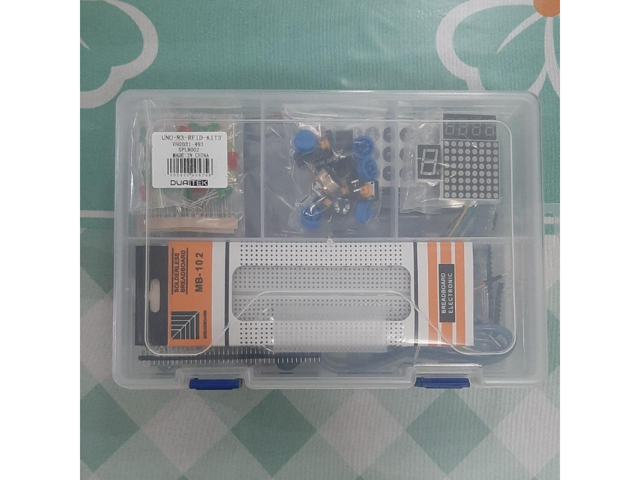 Duaitek Arduino te presenta un kit completo en un portafolio de plástico, ideal para tus proyectos de electrónica y programación. Incluye componentes como Arduino Uno, sensores infrarrojos, módulos de pantalla, motores paso a paso y mucho más. ¡Descubre la creatividad sin límites con Duaitek!