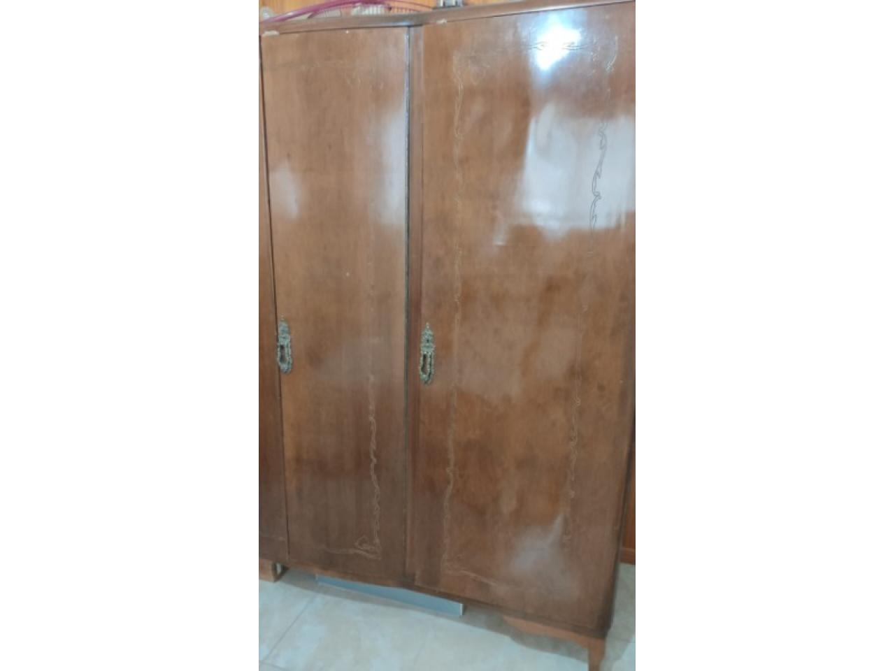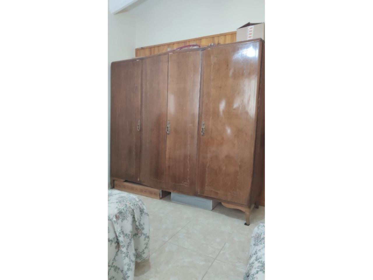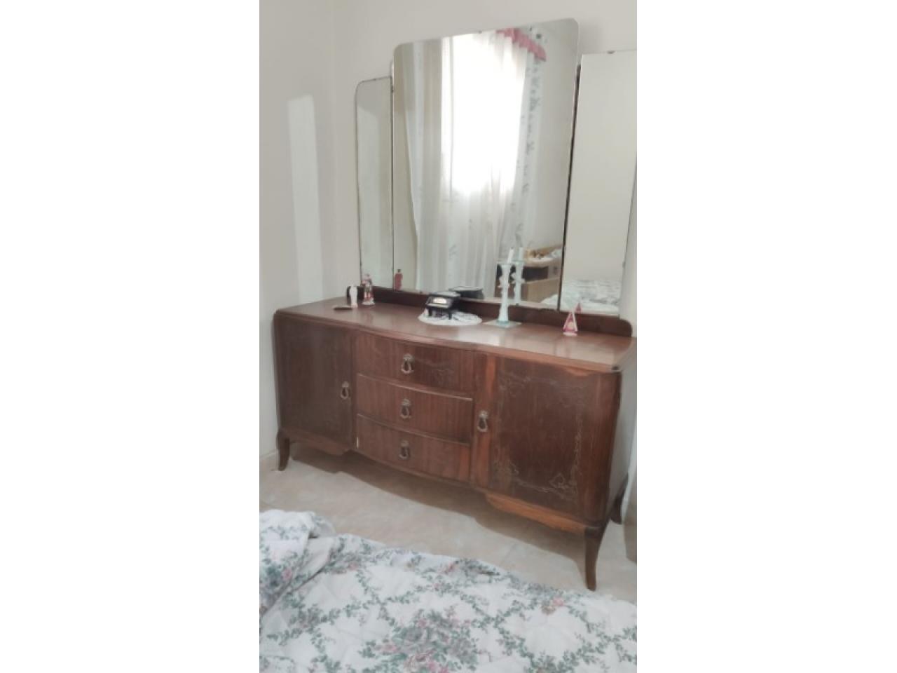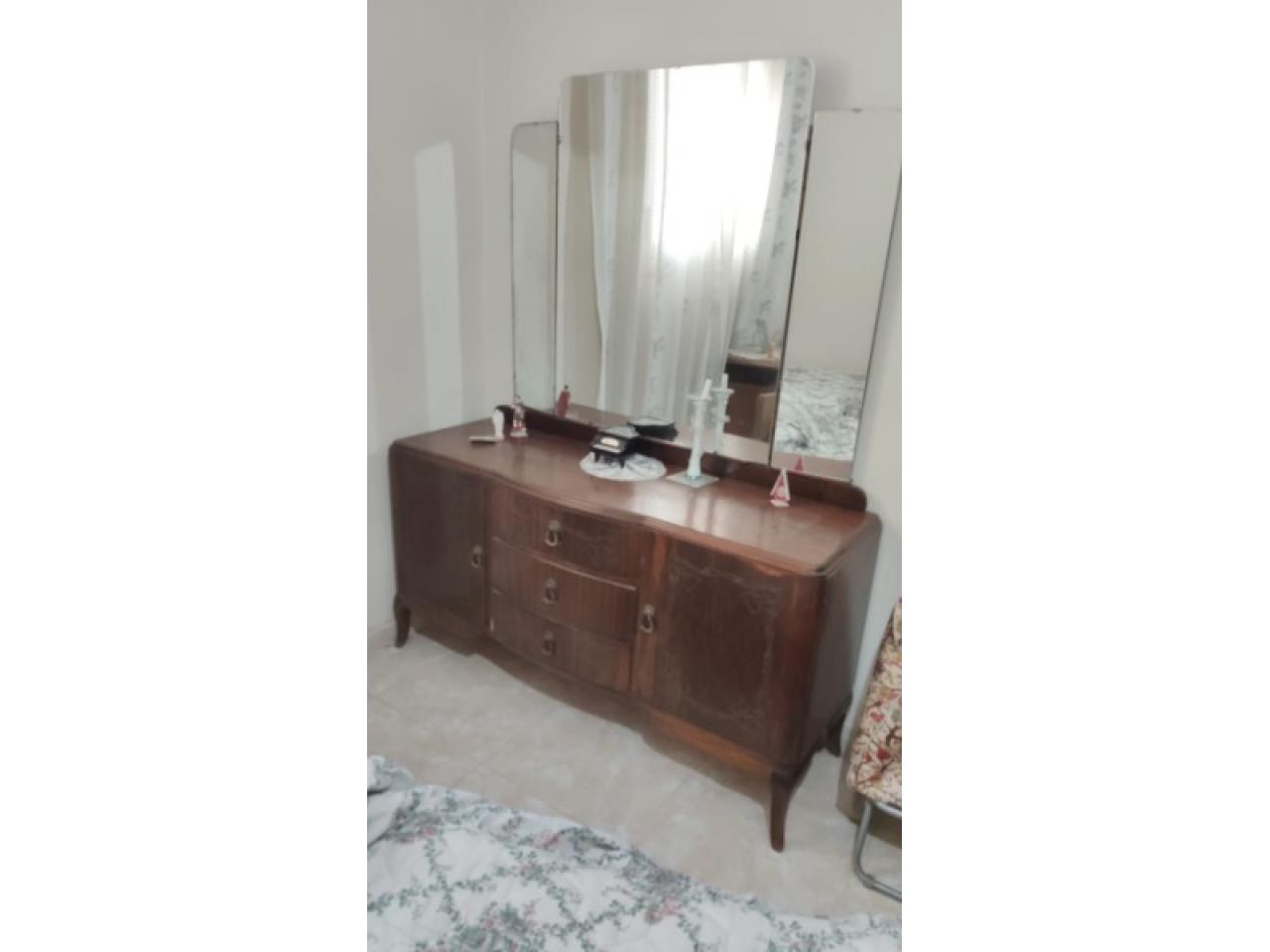 JUEGO DE DORMITORIO ANTIGUO : 2 MESAS DE LUZ, COMODA TIPO TOCADOR CON 3 CAJONES-2 PUERTAS Y TRES ESPEJOS, ROPERO 4 PUERTAS.