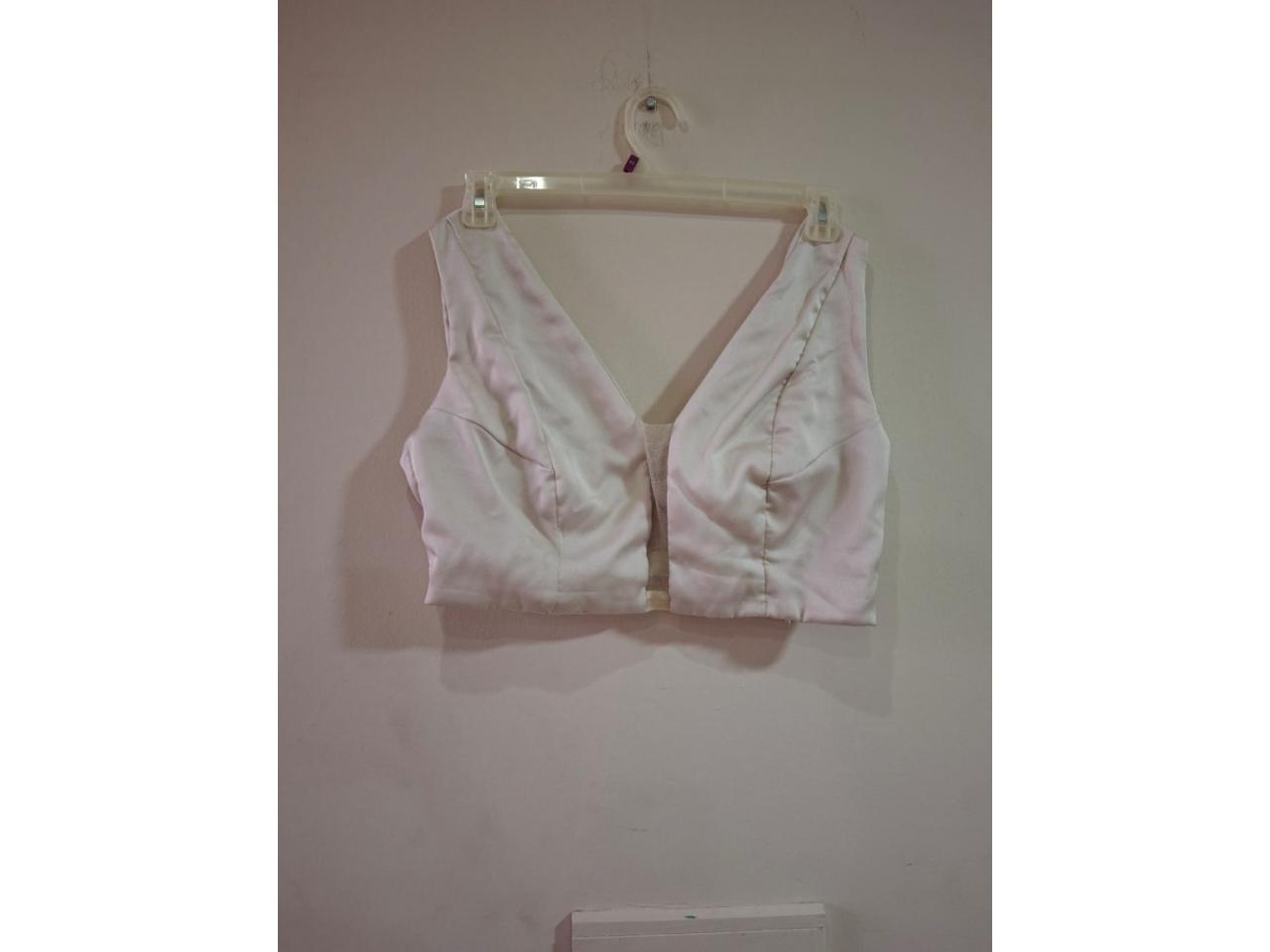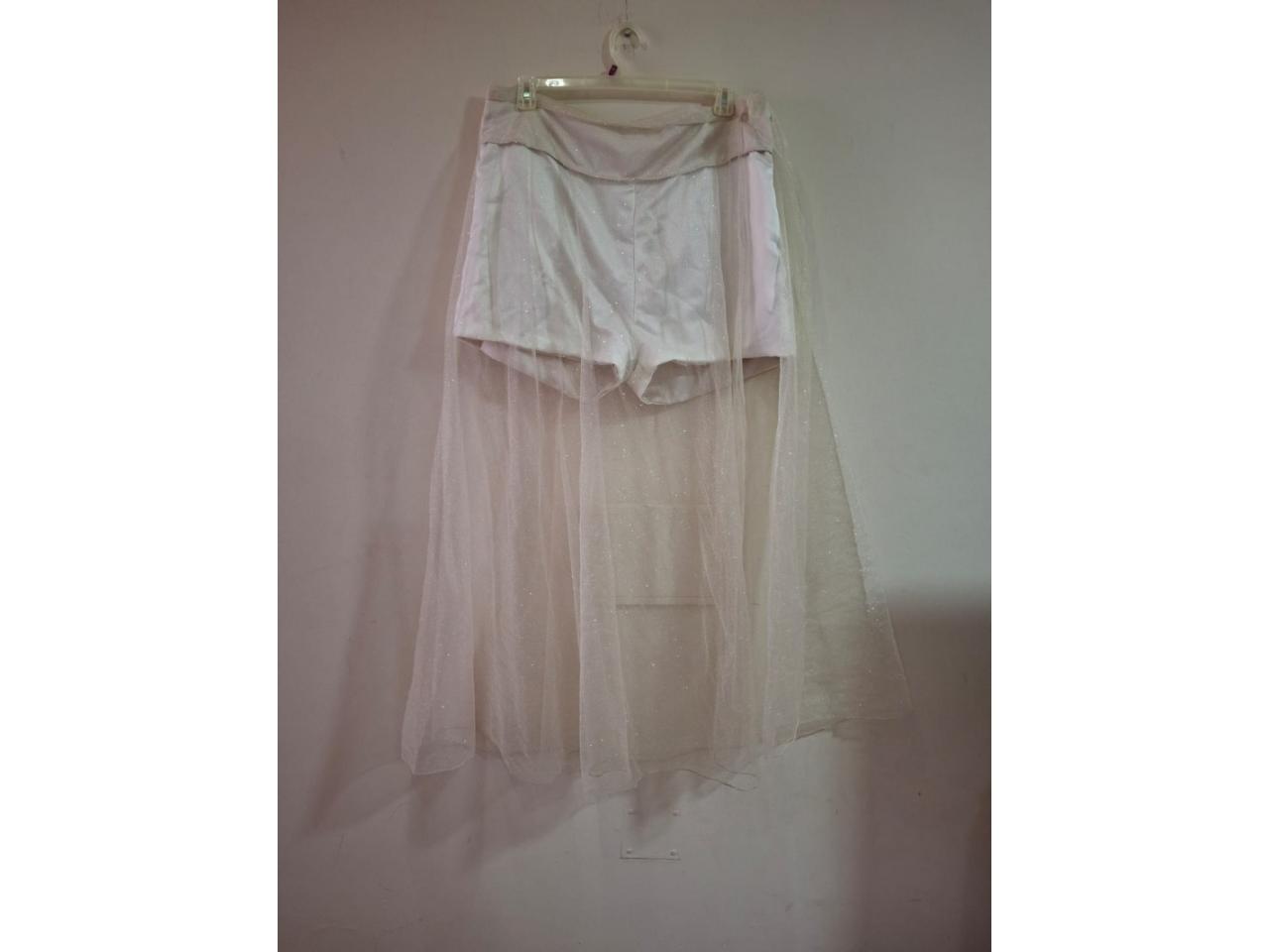 El vestido consta de un short corto de seda color champagne cubierto por una pollera de gaza cristal con brillo, además tiene un top de la misma seda con adornos de gaza cristal.