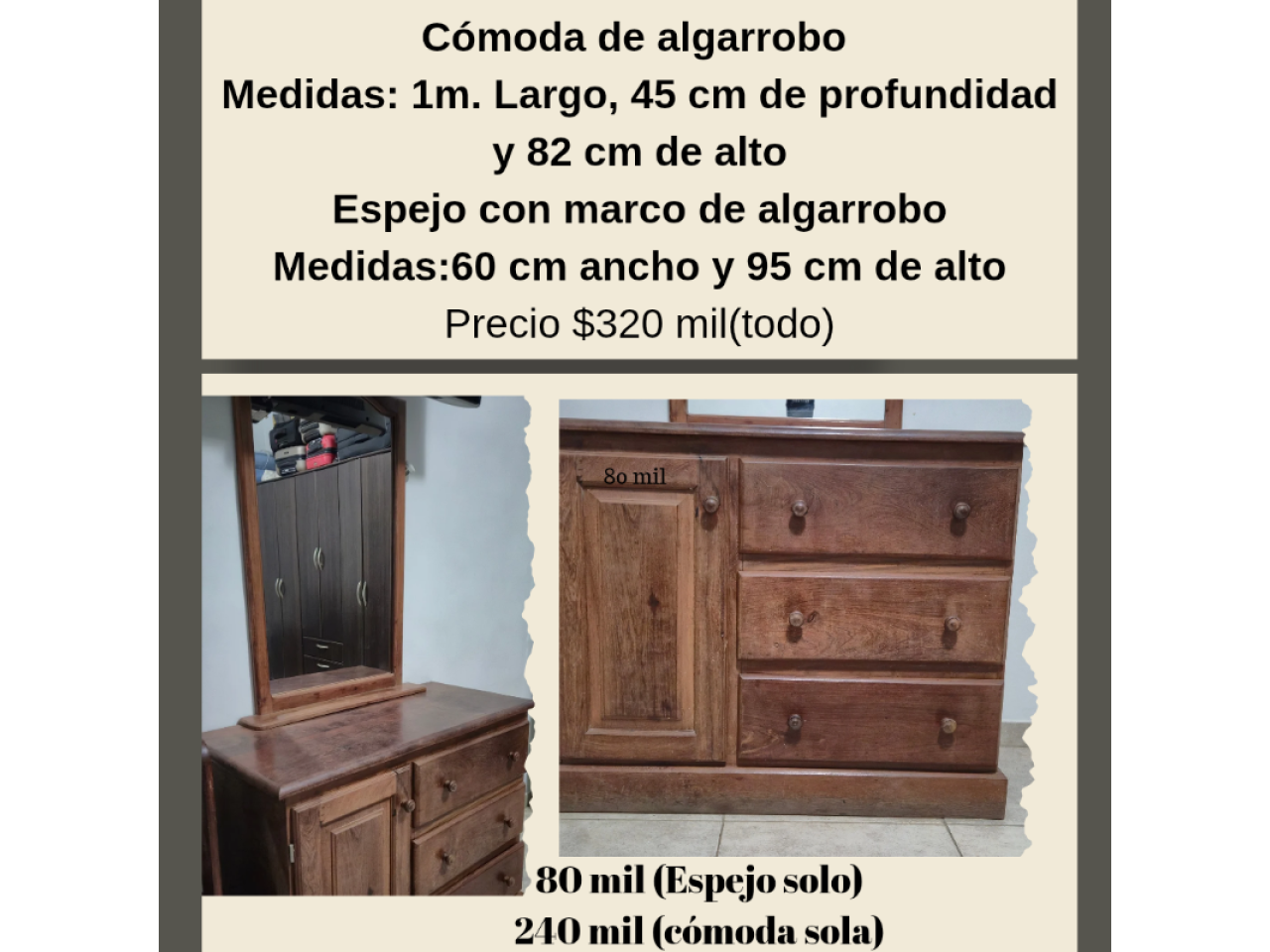 Cómoda de algarrobo. Espejo con marco de algarrobo.