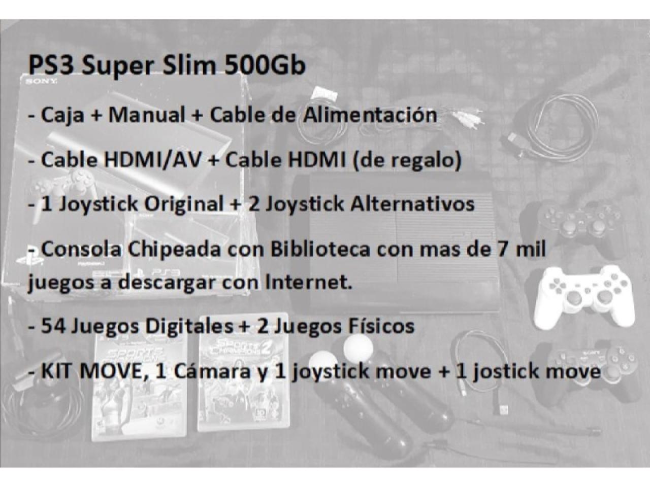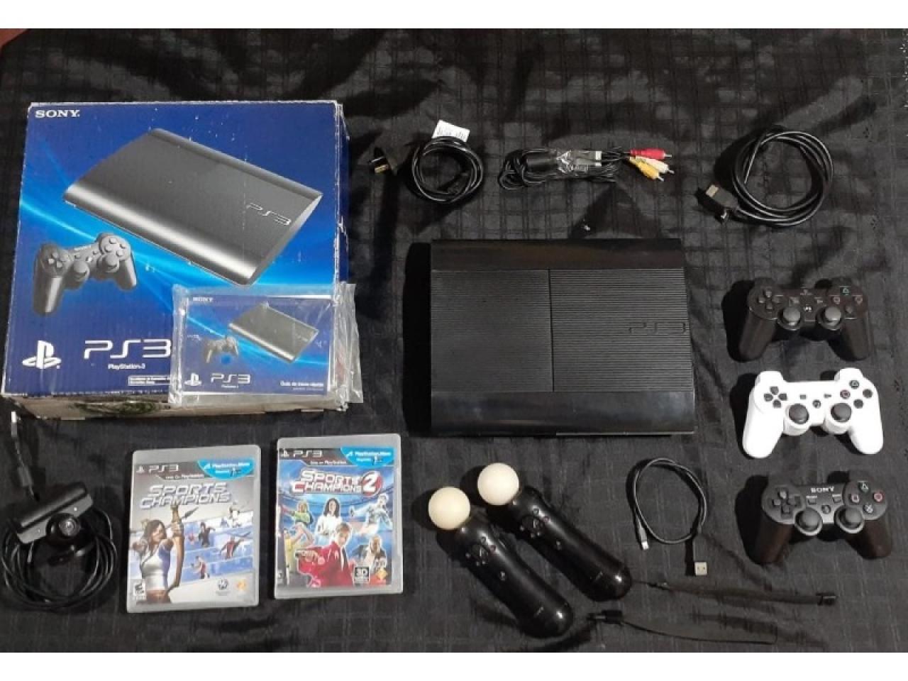 PS3 Super Slim + 3 joystick + 56 juegos + kit move, manuales y caja.