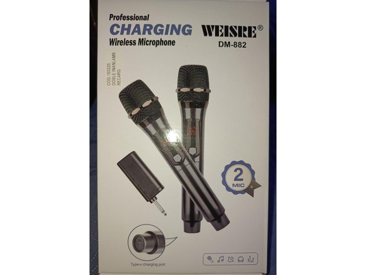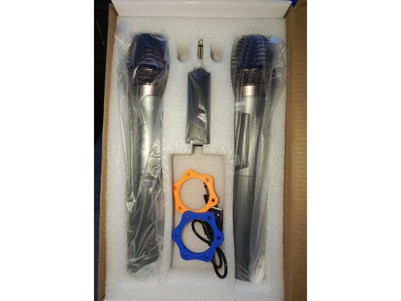 Par de micrófonos profesionales recargables por usb con pilas recargables incluidas . En la caja vienen 2 micrófonos con 1 receptor para ambos todo recargable ppr usb