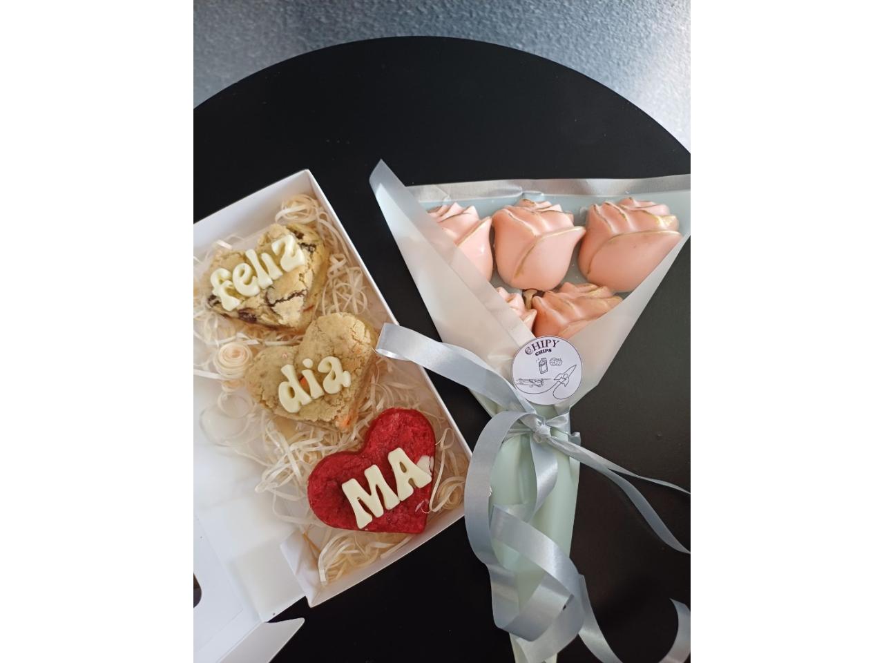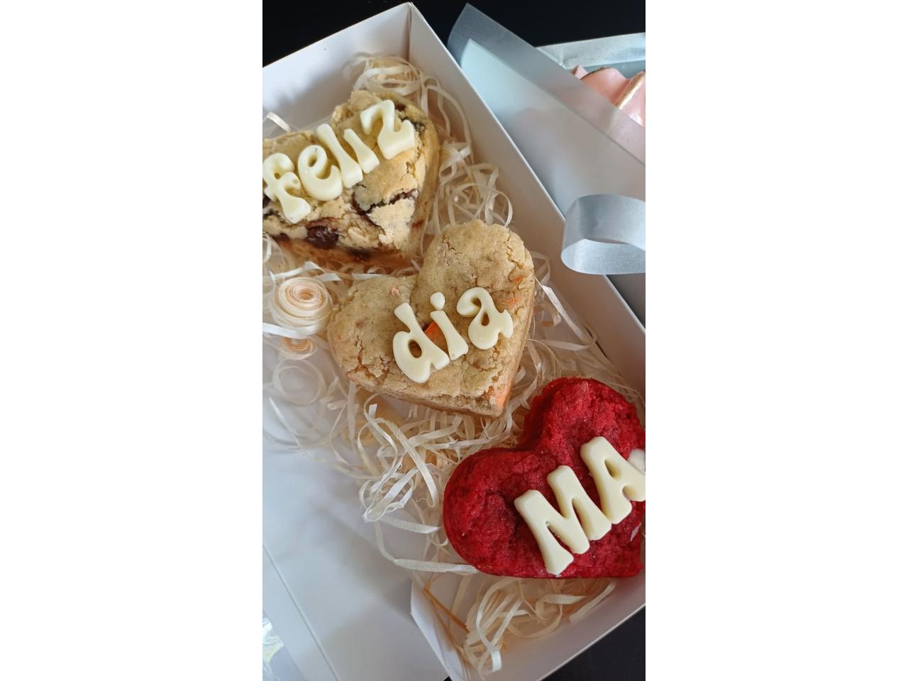 •🍪Una cajita con 3 cookies estilo Nueva York en forma de corazón con letras de chocolate blanco.