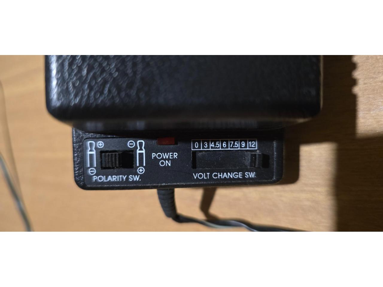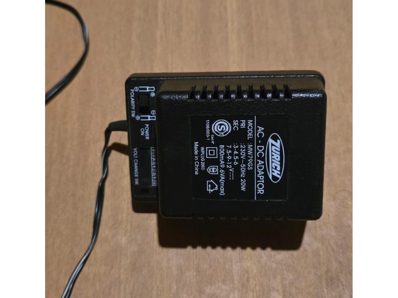 Fuente transformador marca Zurich, modelo MW79GS. Con tecla para regular voltajes ( 0, 3, 4.5, 6, 7.5, 9 y 12 volts) y polaridad. 230v~50hz 20w. Tiene 6 fichas de distintas medidas para conectar.