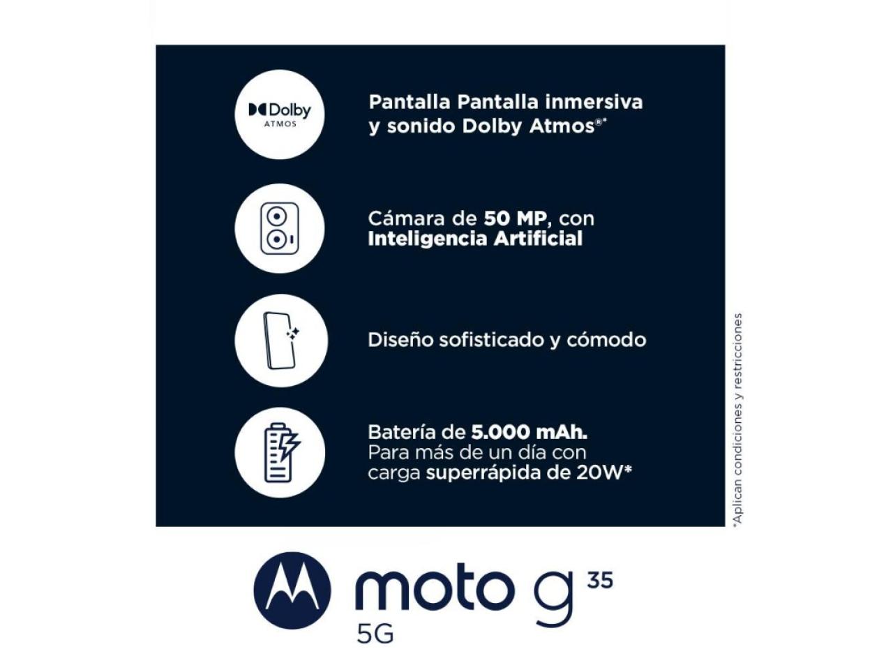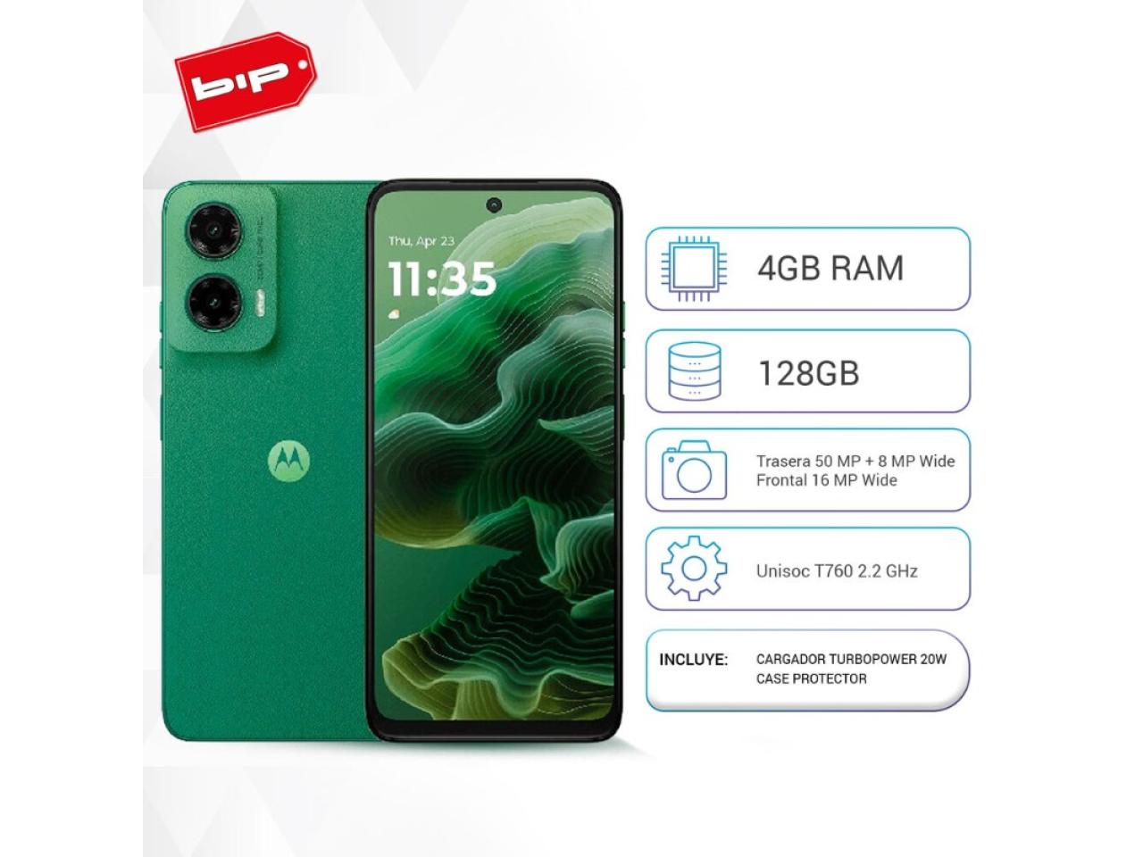 Especificaciones general Procesador Unisoc T760 2.2 Sistema Operativo Android 14.0 (U) Camara trasera 50 MP + 8 MP Wide Frontal 16 MP Wide Memoria ram 4 GB física + 8 GB de RAM Boost con elección automática a través de IA Almacenamiento 128GB Pantalla Tipo de pantalla LCD Tasa de actualización 120 Hz Conectividad WIFI 2.4 / 5 GHz, 802.11 a/b/g/n/ac Bandas Red 2G, 3G, 4G, 5G Bluetooth Sí, BT 5.0Servicios de Ubicación GPS NFC Sí Batería Cargador Charger 20 W Capacidad 5000 mAh Otros Resistencia al agua Sí / Salpicaduras IPX IP52