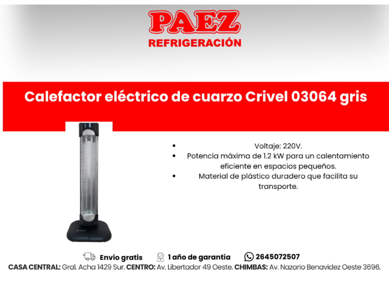 Potencia máxima de 1.2 kW para un calentamiento eficiente en espacios pequeños.