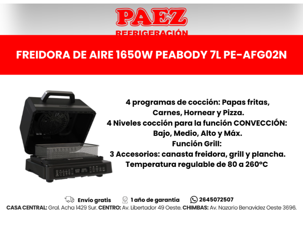 3 Accesorios: canasta freidora, grill y plancha.