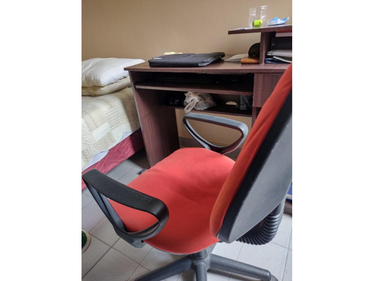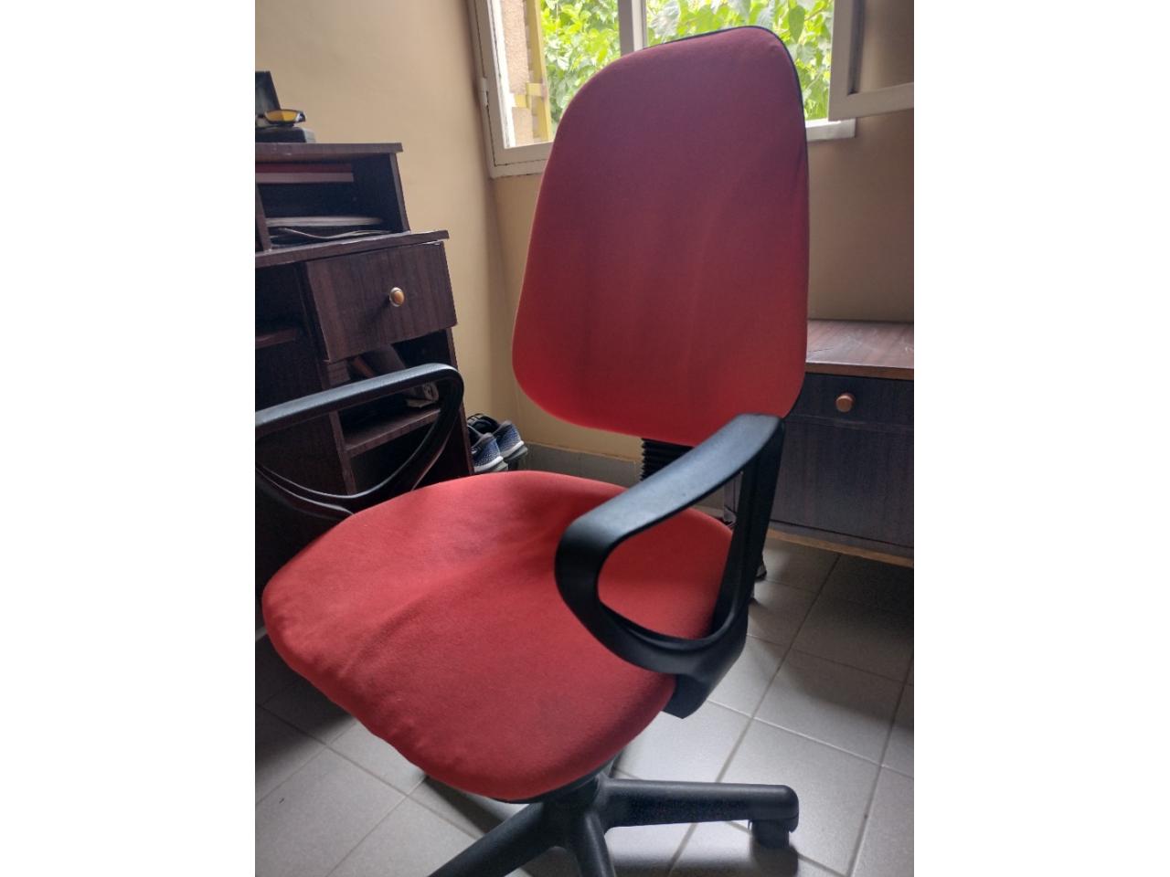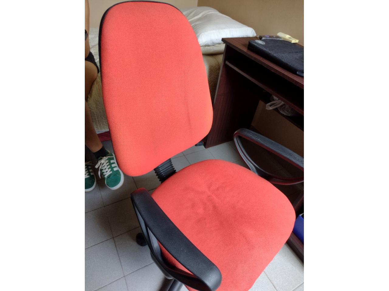 Silla de escritorio color rojo y negro. Cuenta con 5 rudas funcionales, respaldar reclinable y regulador de altura.