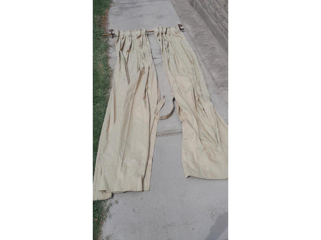 tengo 2 juegos iguales , cada paño mide 2,45 x 70 (son 4), con el caño y apliques para cada juego, y tienen la tira para sujetar a la pared , el precio es de un juego