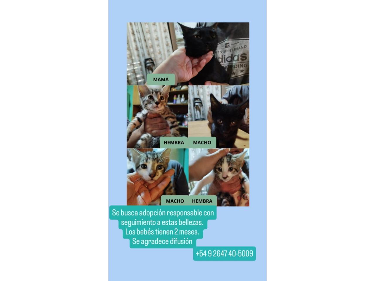 Adopción Responsable para 5 gatos, cuatro cachorros y su mamá. Son dos cachorros hembras y dos machos de 2 meses y medio. La mamá es una gata joven, perdida que tuvo sus gatitos en mi casa y lamentablemente no puedo quedarmelos.