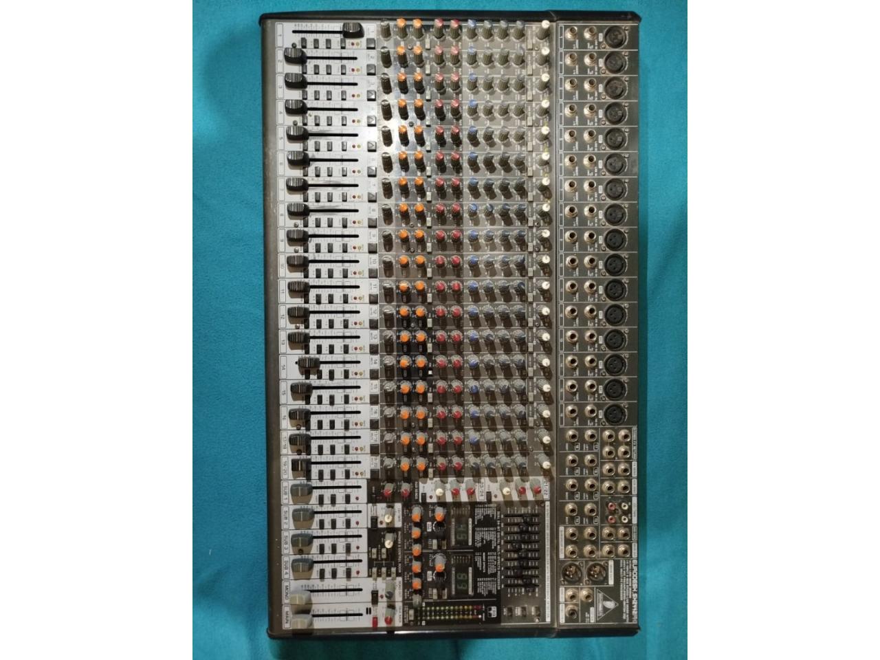 ESPECIFICACIONES: mesa de mezclas analógica robusta de 24 canales (16 mono + 4 estéreo), con preamplificadores XENYX, procesadores de efectos digitales dobles de 24 bits, EQ gráfico estéreo de 9 bandas con FBQ, compresores en canales mono, 4 subgrupos y múltiples envíos auxiliares, ideal para sonido en vivo y estudio, destacando su diseño para giras y fuente de alimentación universal. Excelente estado.