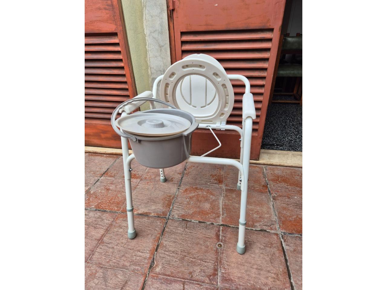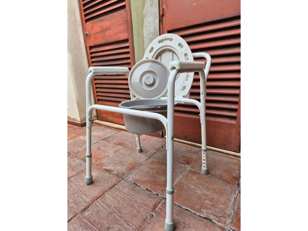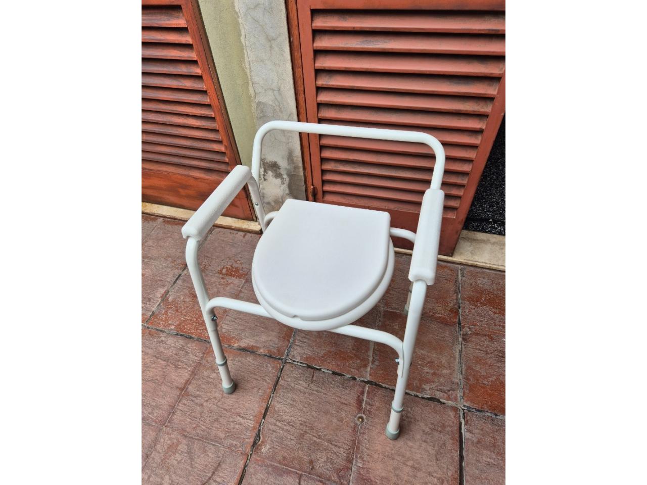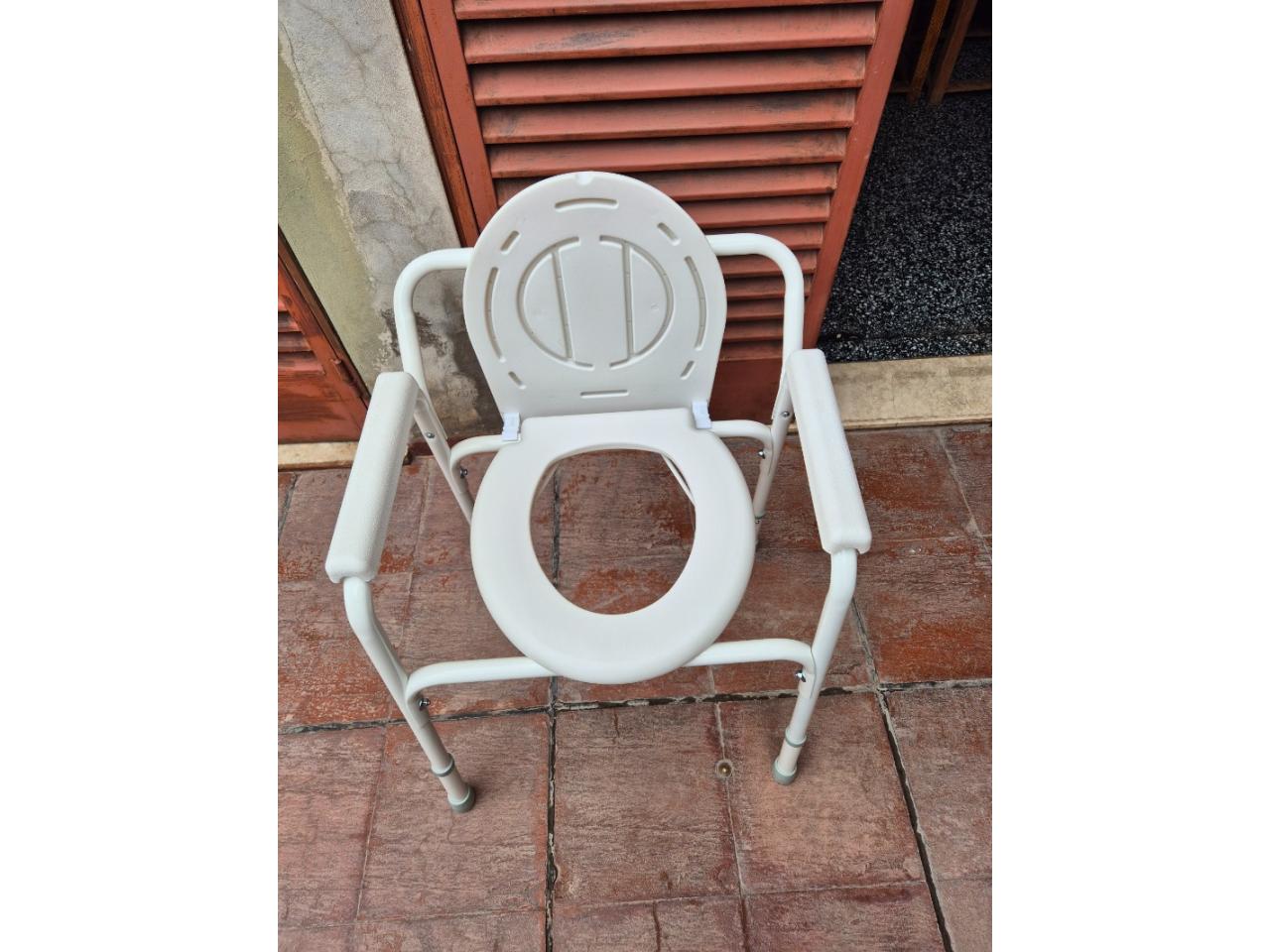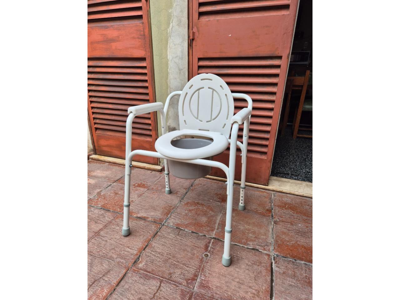 Silla portátil con apoyabrazos para elevar altura del inodoro. Para personas imposibilitadas de usar (por la altura) un inodoro habitual.