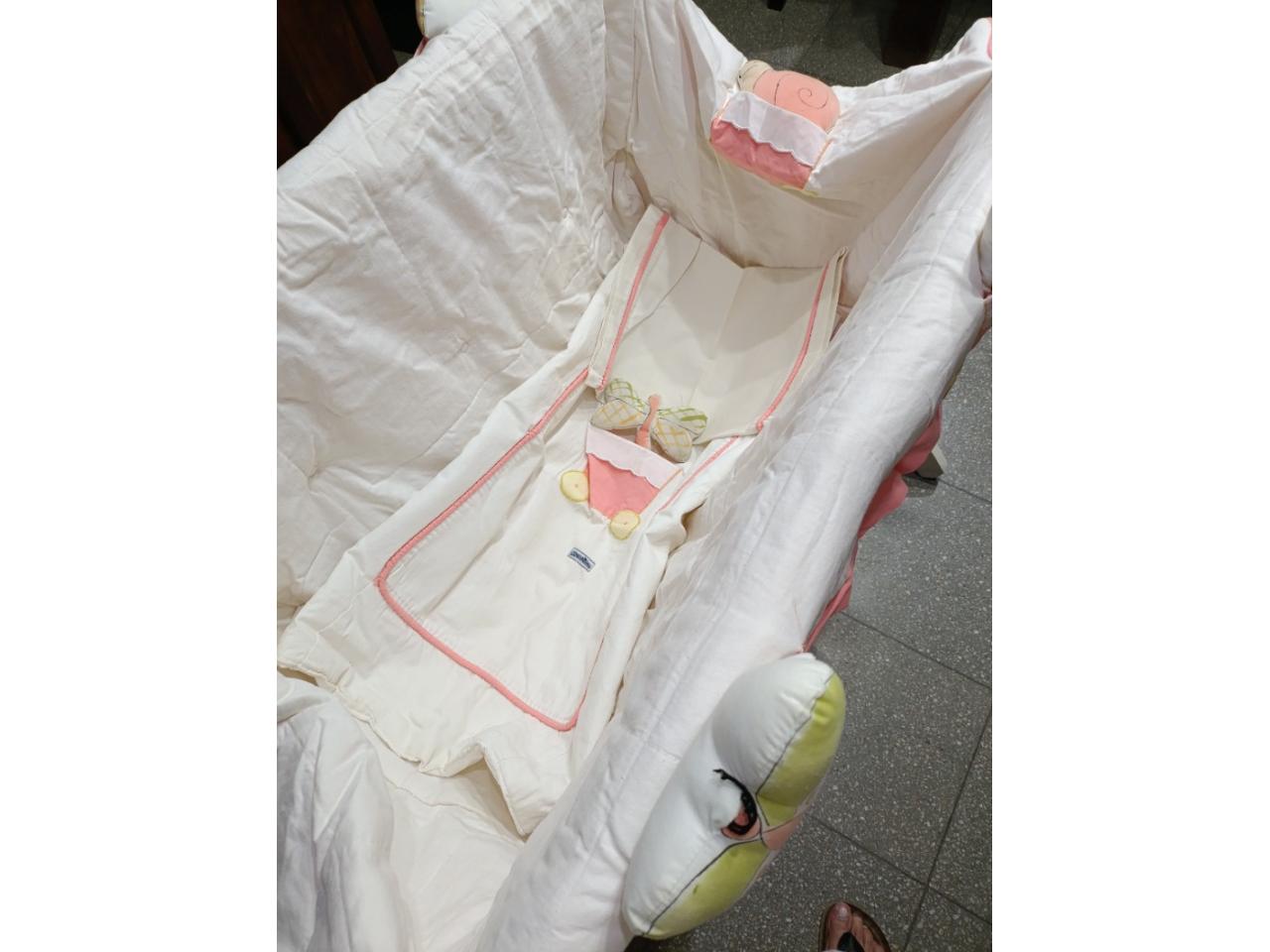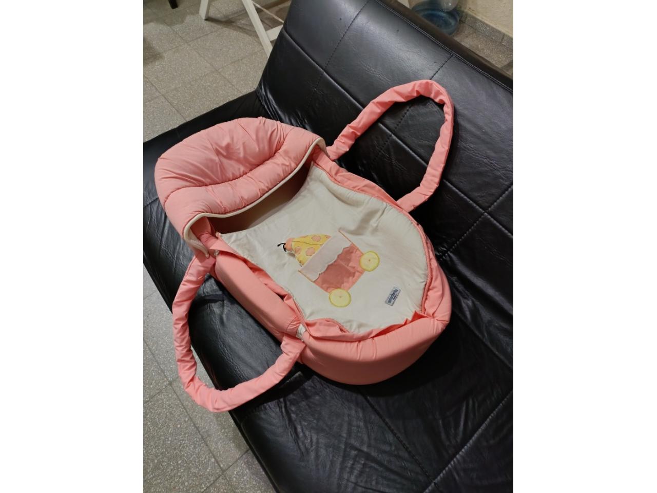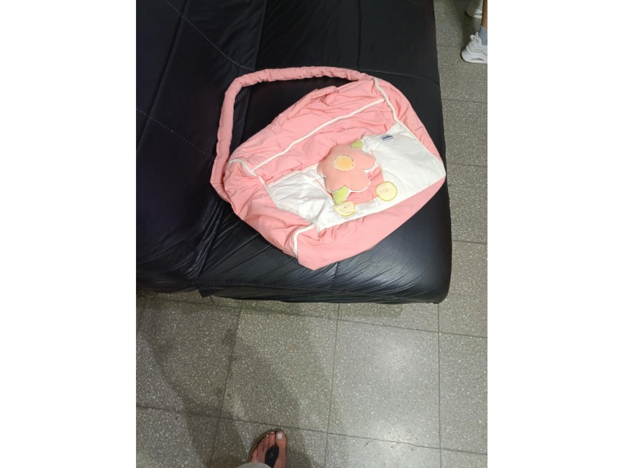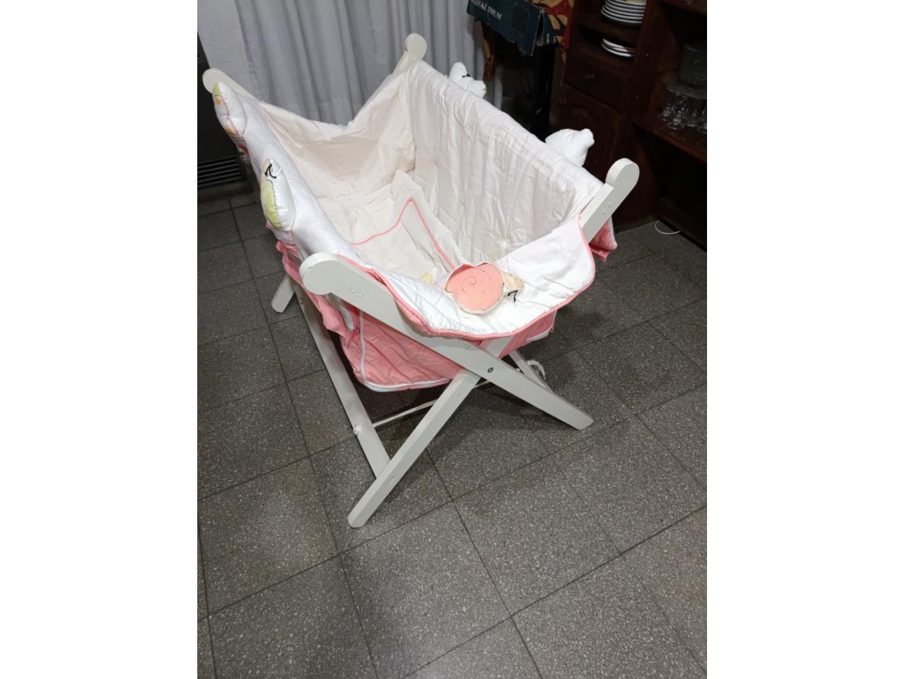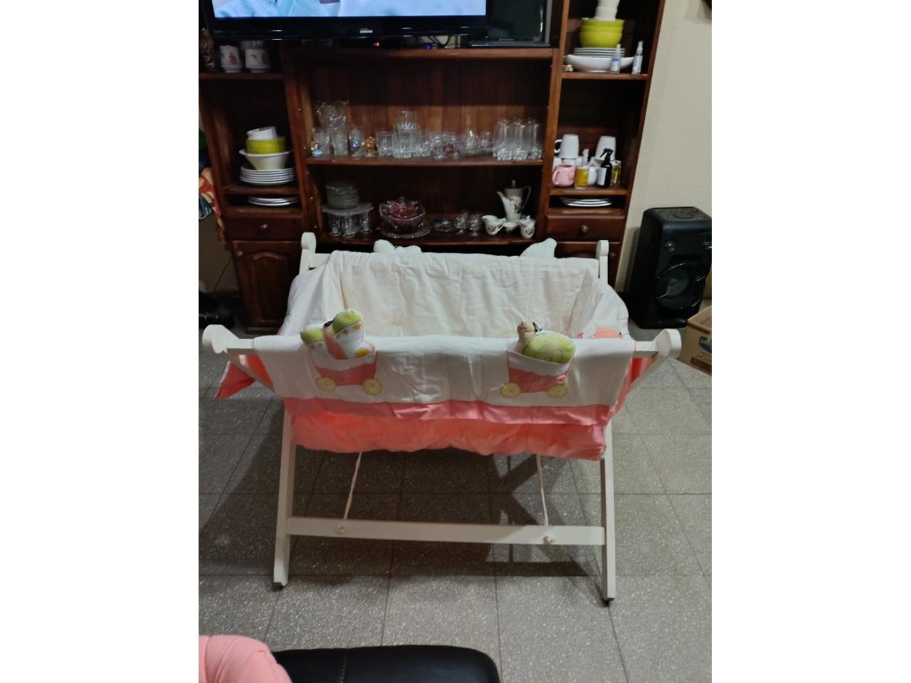 Catre de madera con accesorios (cuna portátil + bolso) color coral y blanco .