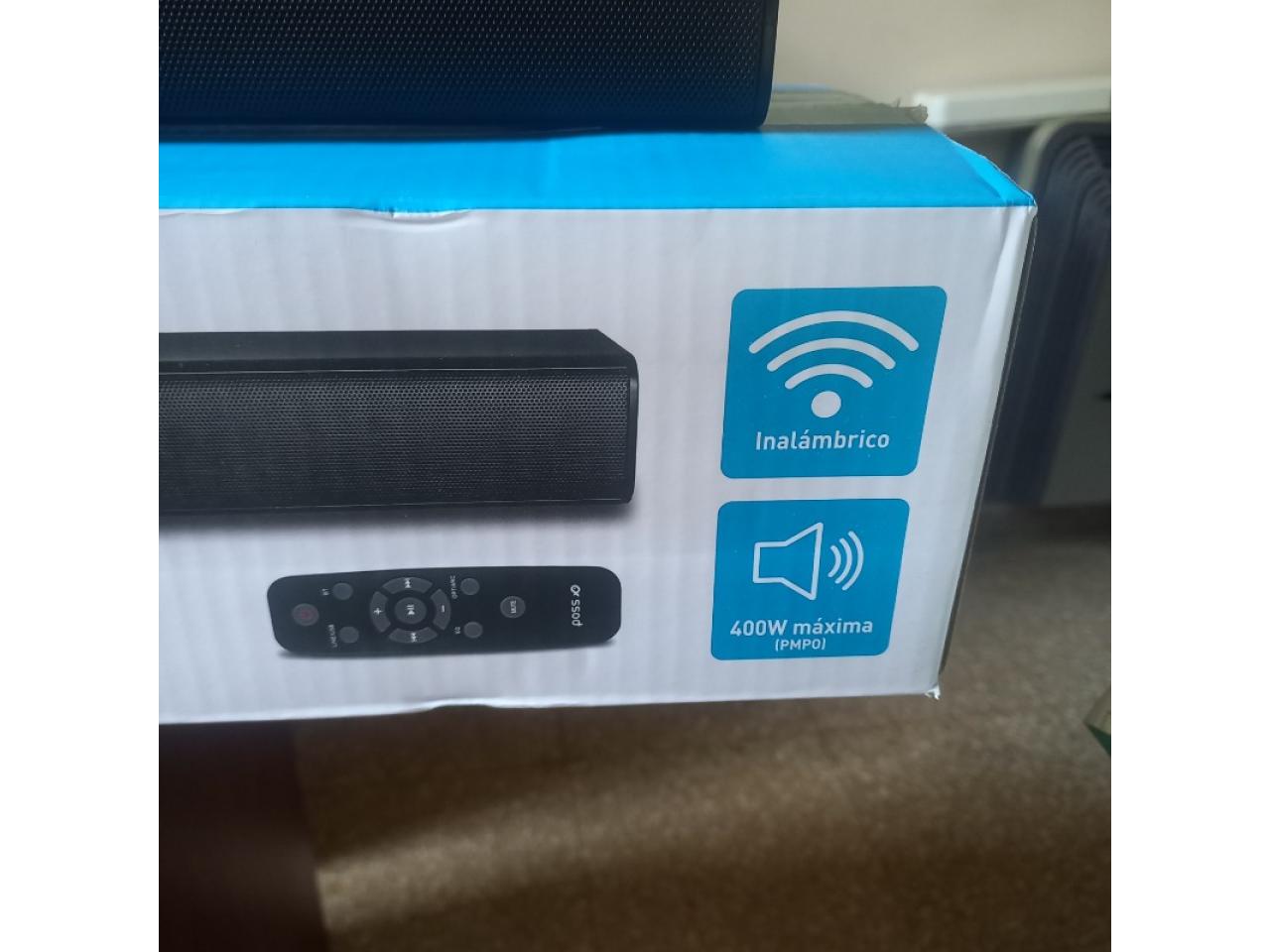 Barra de sonido inhalambrica, 400 w máximo de potencia con control remoto sin uso..