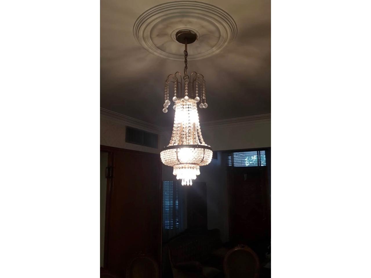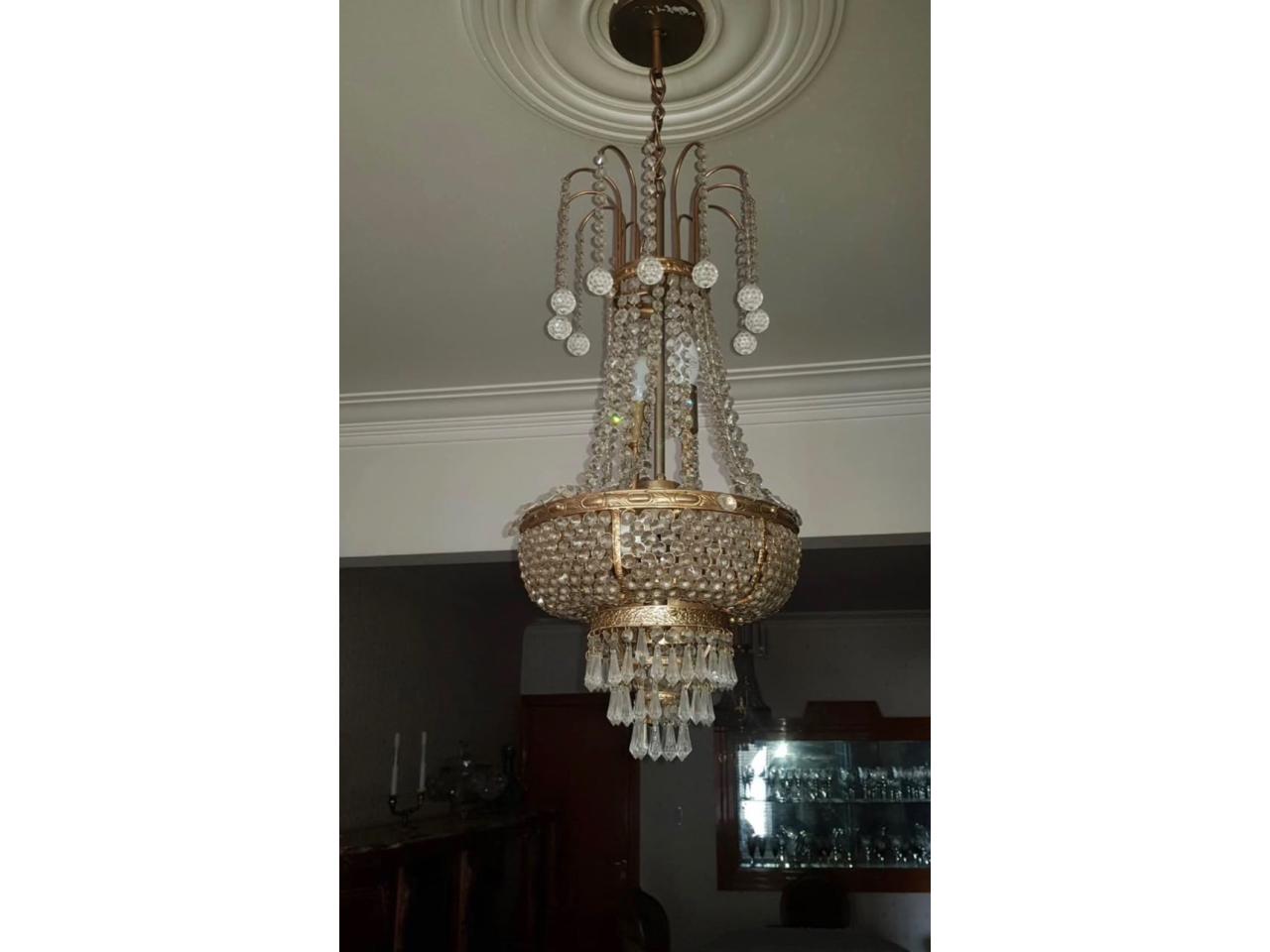 Araña dorada brillante, con cristales, altura 70 cm , con cadena su altura es 1 mt.,diámetro 30 cm, 8 lámparas.