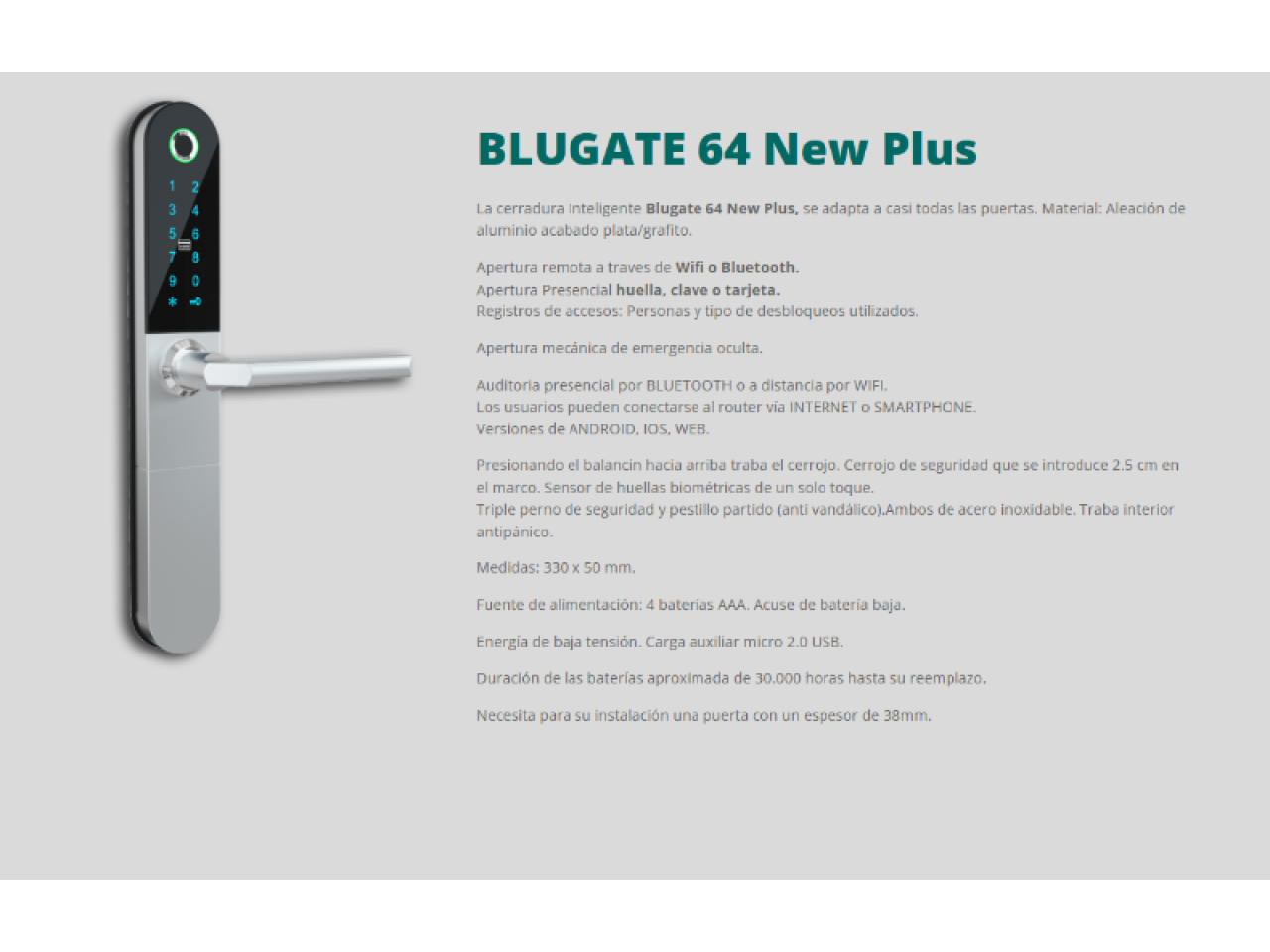 La cerradura Inteligente Blugate 64 New Plus tiene un diseño elegante y discreto. Es una cerradura inteligente completamente segura por su triple traba y cerrojo independiente.