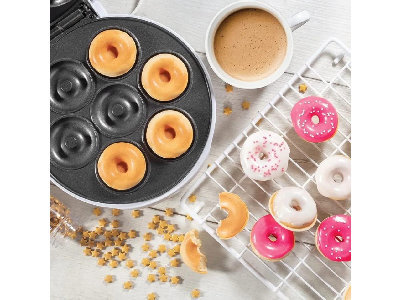 Con siete orificios para moldes para rosquillas, puede satisfacer las necesidades de desayuno de una familia.