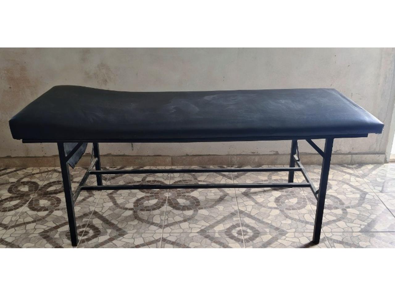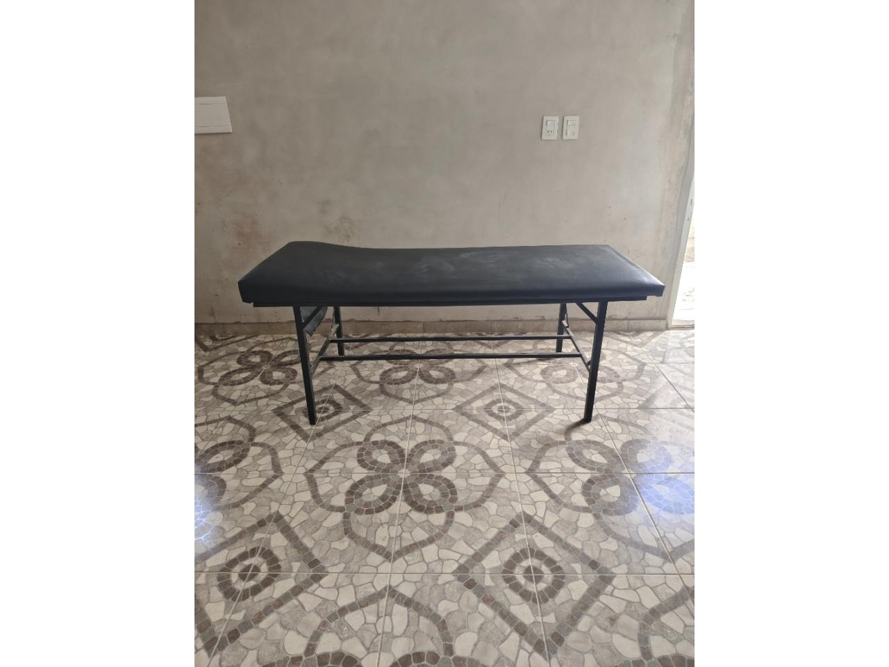 Cama con patas fijas. Recubierta con cuero negro