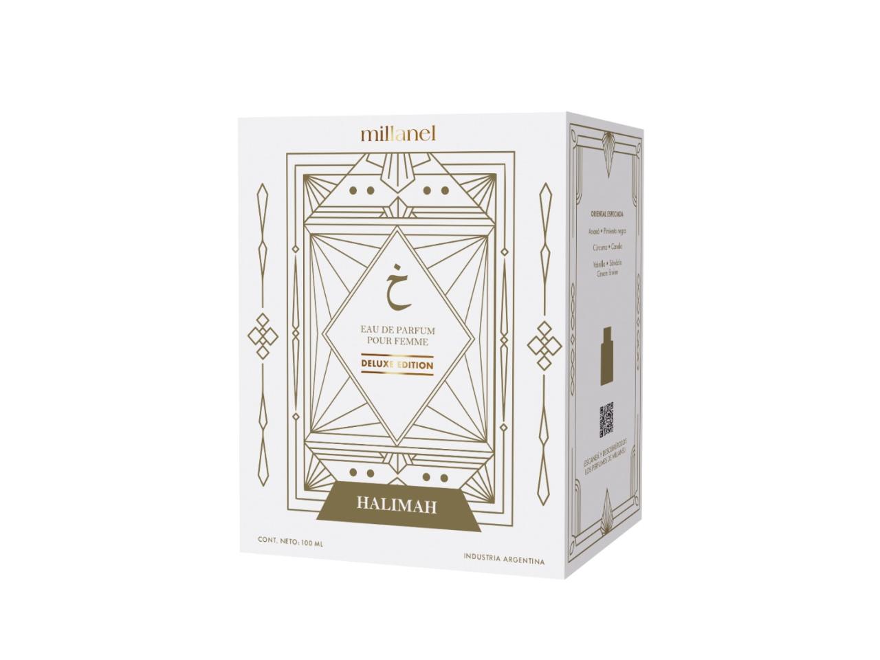 Halimah, es un perfume de la exclusiva línea Deluxe Edition de Millanel, inspirado en los secretos de los antiguos palacios árabes. Su exquisita combinación de ananá y sándalo evoca la exuberancia de los jardines orientales, mientras que la calidez de las especias exóticas añade un toque irresistible.