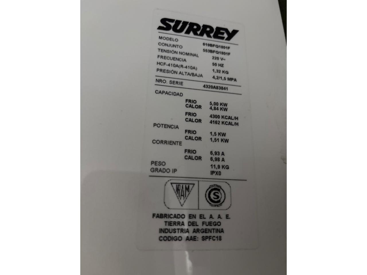 Aire acondicionado Surrey 4500 frío calor, muy poco uso instalado funcionando, incluye cañerías y soporte de unidad externa.