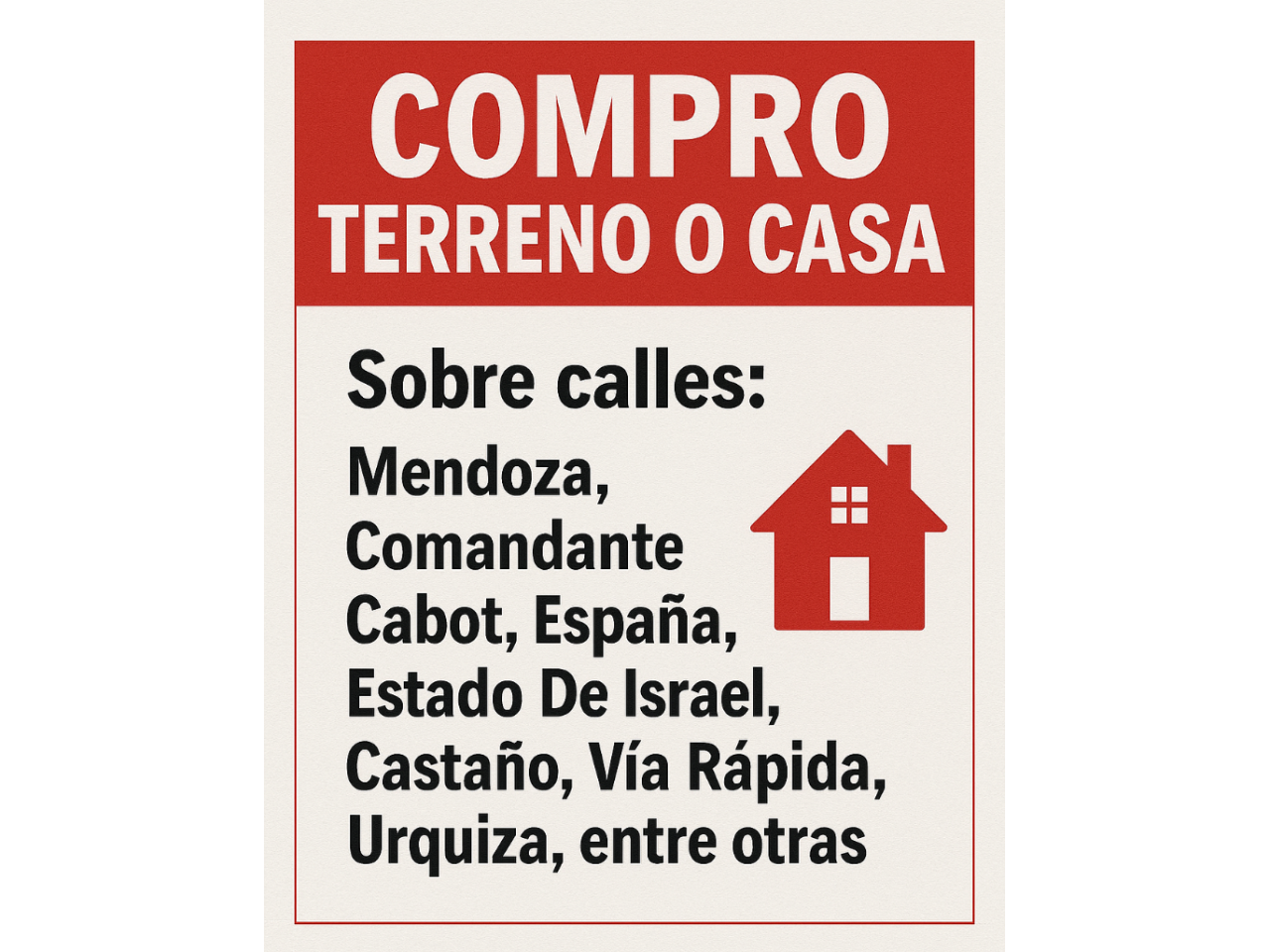 Compro Casa o Terreno puede ser sobre Calle Mendoza - Comandante Cabot - España - Estado de Israel - Castaño. Puede ser de unos 400m2 aproximadamente. Escucho ofertas serias.