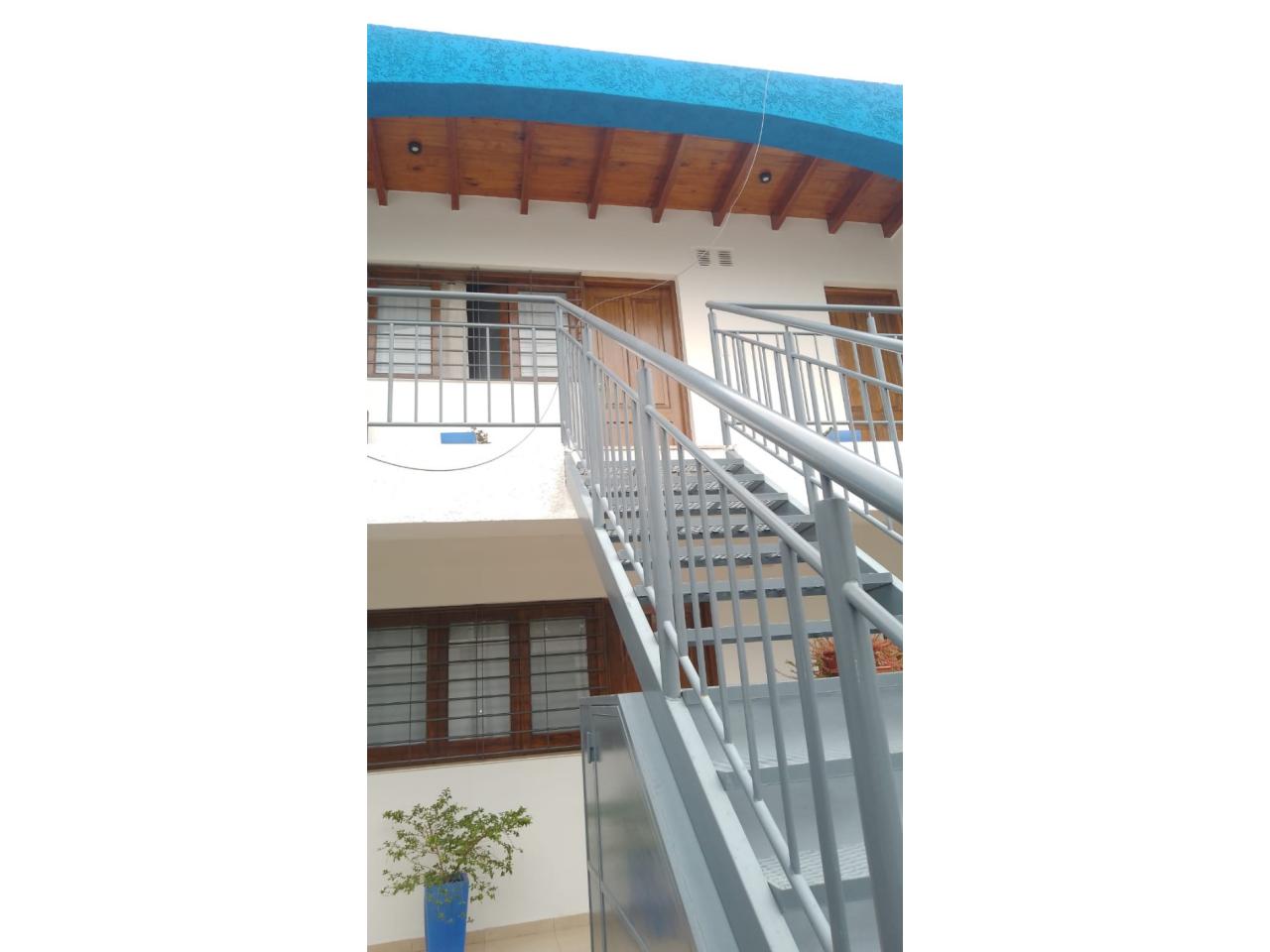 Es un departamento en Planta Alta que integra un consorcio de seis dptos., con cochera, máximo para dos personas sin mascotas. Está disponible para ocupar de inmediato. Tiene un estar comedor equipado con artefacto de cocina, bajo mesada, alacena, calefón, mesada de granito natural. Dispone de un baño completo, un dormitorio con placard, un pequeño sector de lavadero con pileta para lavar y lugar para lavarropa. Tiene rejas en todas las ventanas, portero eléctrico con visor a color y portón automatizado en cochera. No tiene gastos de expensas sólo municipalidad, OSSE, energía y gas natural a cargo del inquilino. Toda la carpintería es lustrada. Está ubicado en la Villa América a una cuadra s de la Plaza Evita, en calle Perú entre Juan Jufré y Falucho.