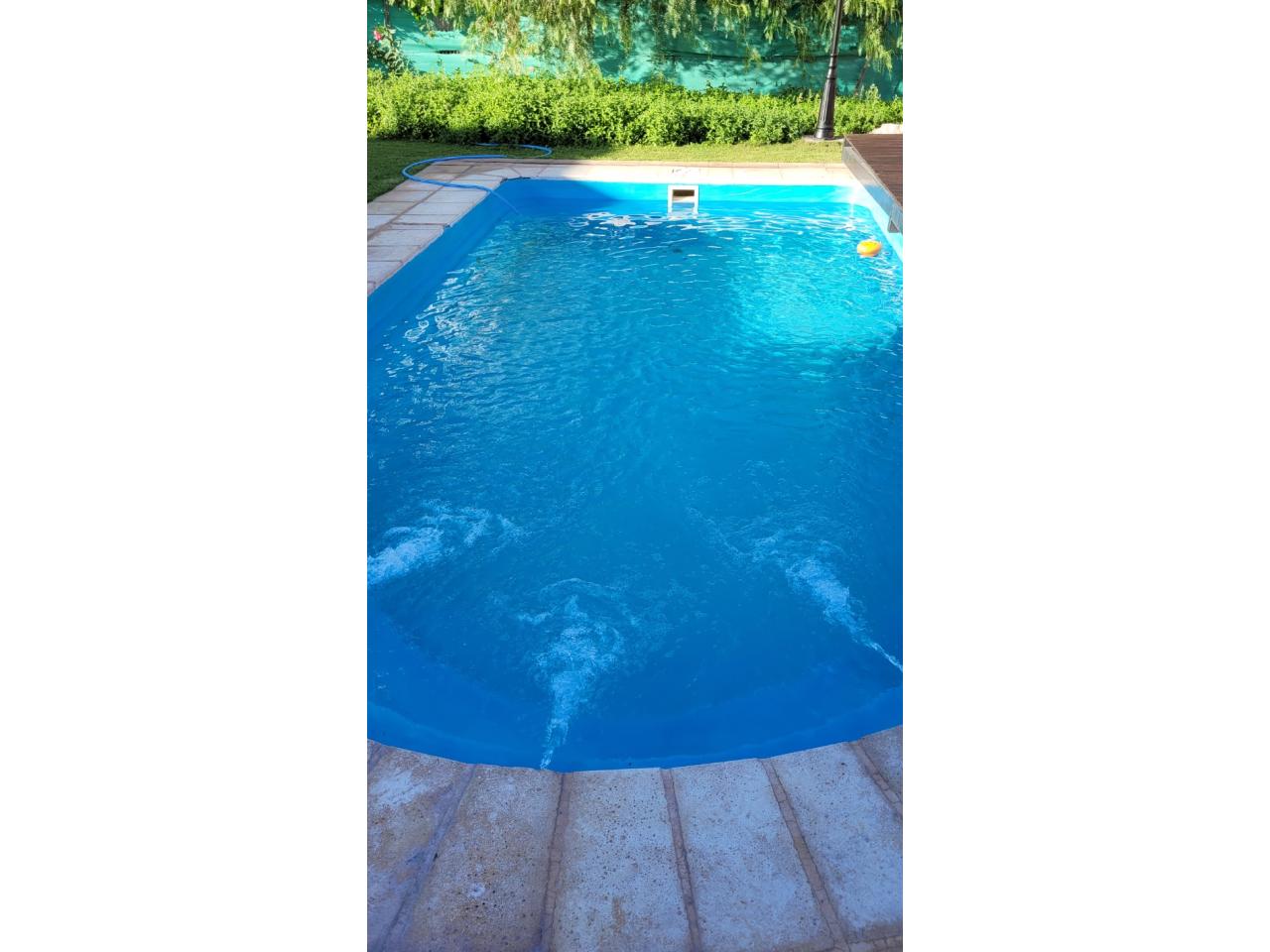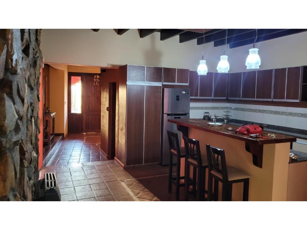La casa cuenta con: 1 dormitorio, baño en suite, cocina, living comedor, baño de visitas, hall de entrada, lavadero amoblado, despensa, quincho techado con parillero, galería a la salida de la habitación y cocina con techo con loza, pileta con deck y parquizado, cerco con boyero.