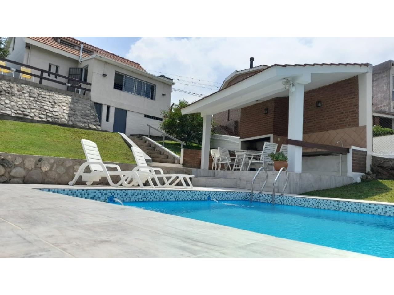 3 dormitorios (6 huéspedes) , Living- comedor- cocina independiente con desayunador- baño principal zonificado- jardín de invierno con vistas hacia el lago y la piscina- quincho c/asador Amplia terraza- garaje 3537 659778