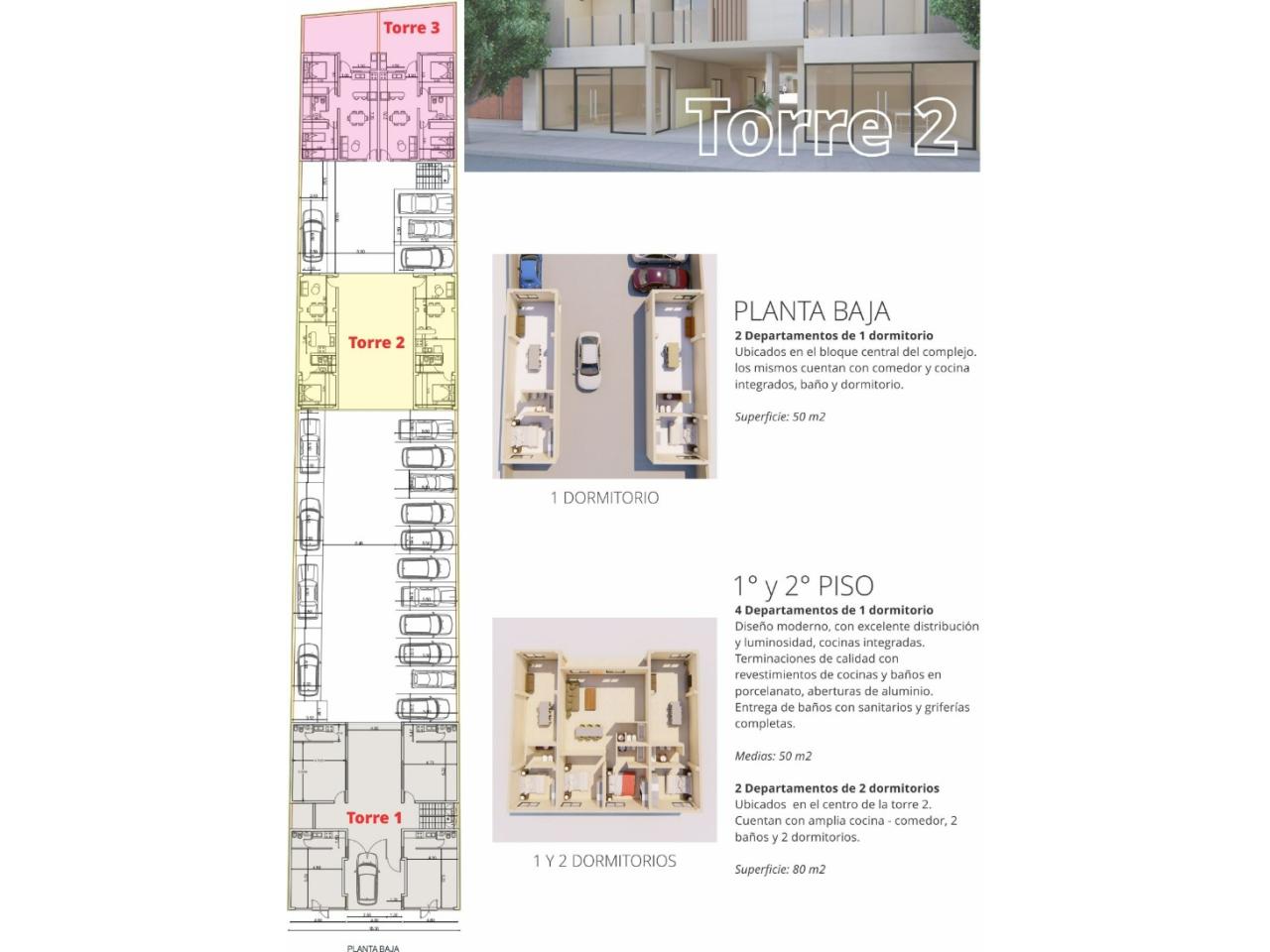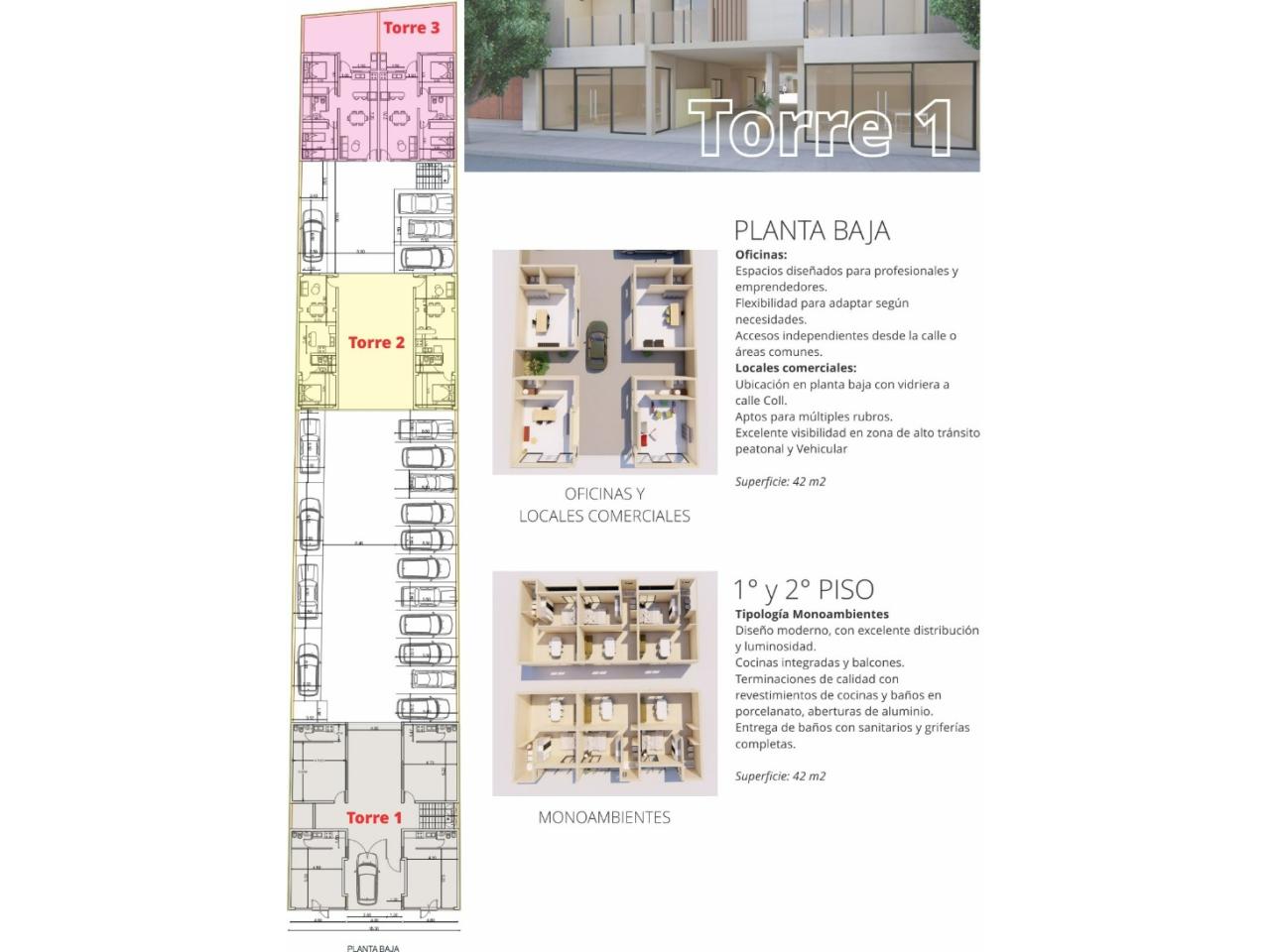 • Departamentos Monoambientes de 42 m2, de 1 dormitorio de 50 m2 y 2 dormitorios de 68 y 80 m2