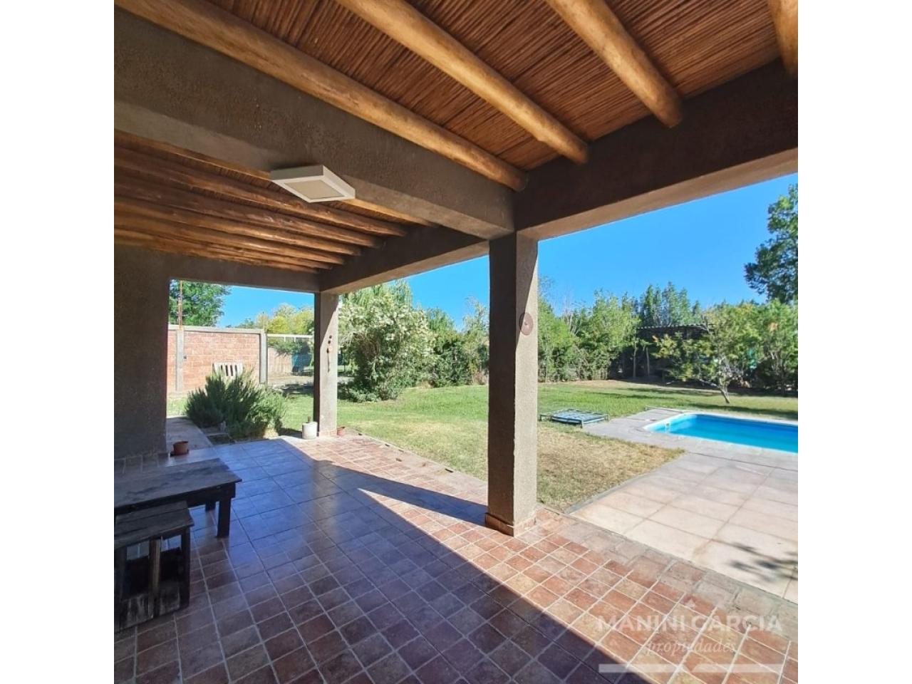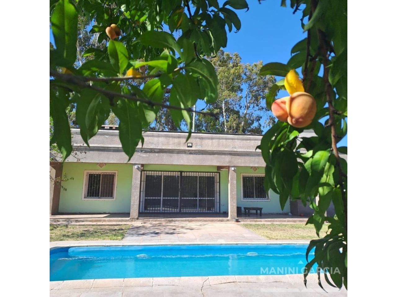 Casa de dos dormitorios con dos baños, amplio living comedor con cocina y desayunador, cuenta con pileta, galeria, cesped y arboles frutales.