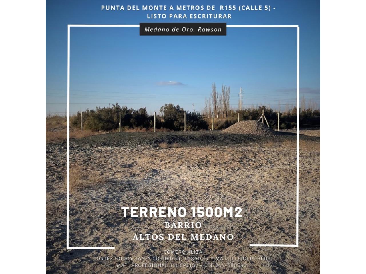 Terreno disponible en Médano de Oro, Rawson de 1500 m². El barrio ubicado sobre calle Punta del Monte está alejado de la ciudad, pero con fácil acceso a rutas principales.