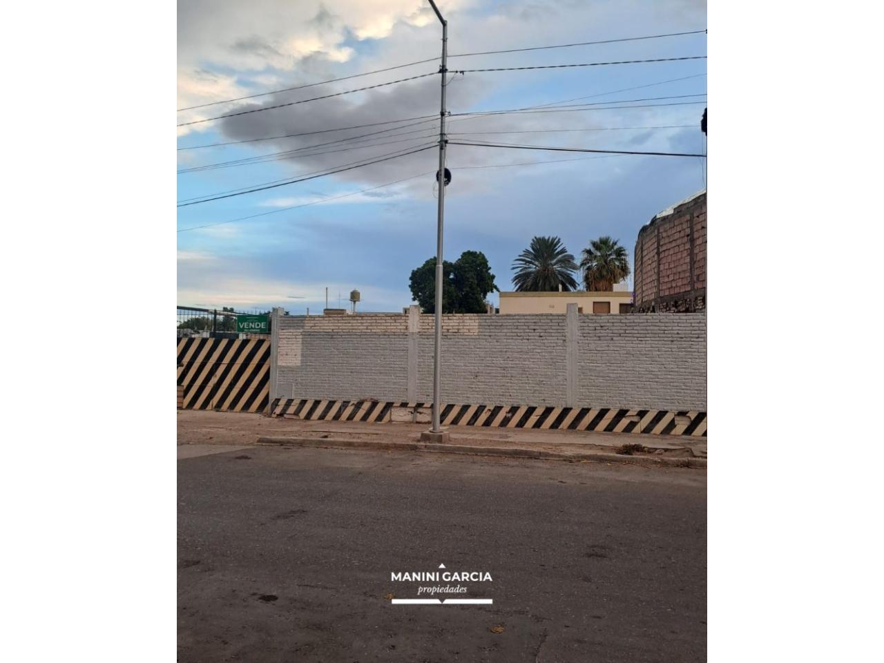 Frente cerrado con muro de ladrillos y porton de acceso, cierre perimetral en 3 caras del lote y todos los servicios en puerta.