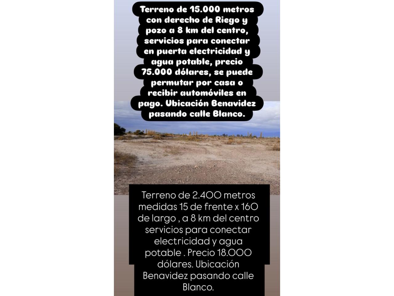 Terreno de 15.000 metros con derecho de Riego y pozo a 8 km del centro, servicios para conectar en puerta electricidad y agua potable, precio 75.000 dólares, se puede permutar por casa o recibir automóviles en pago. Ubicación Benavidez pasando calle Blanco.