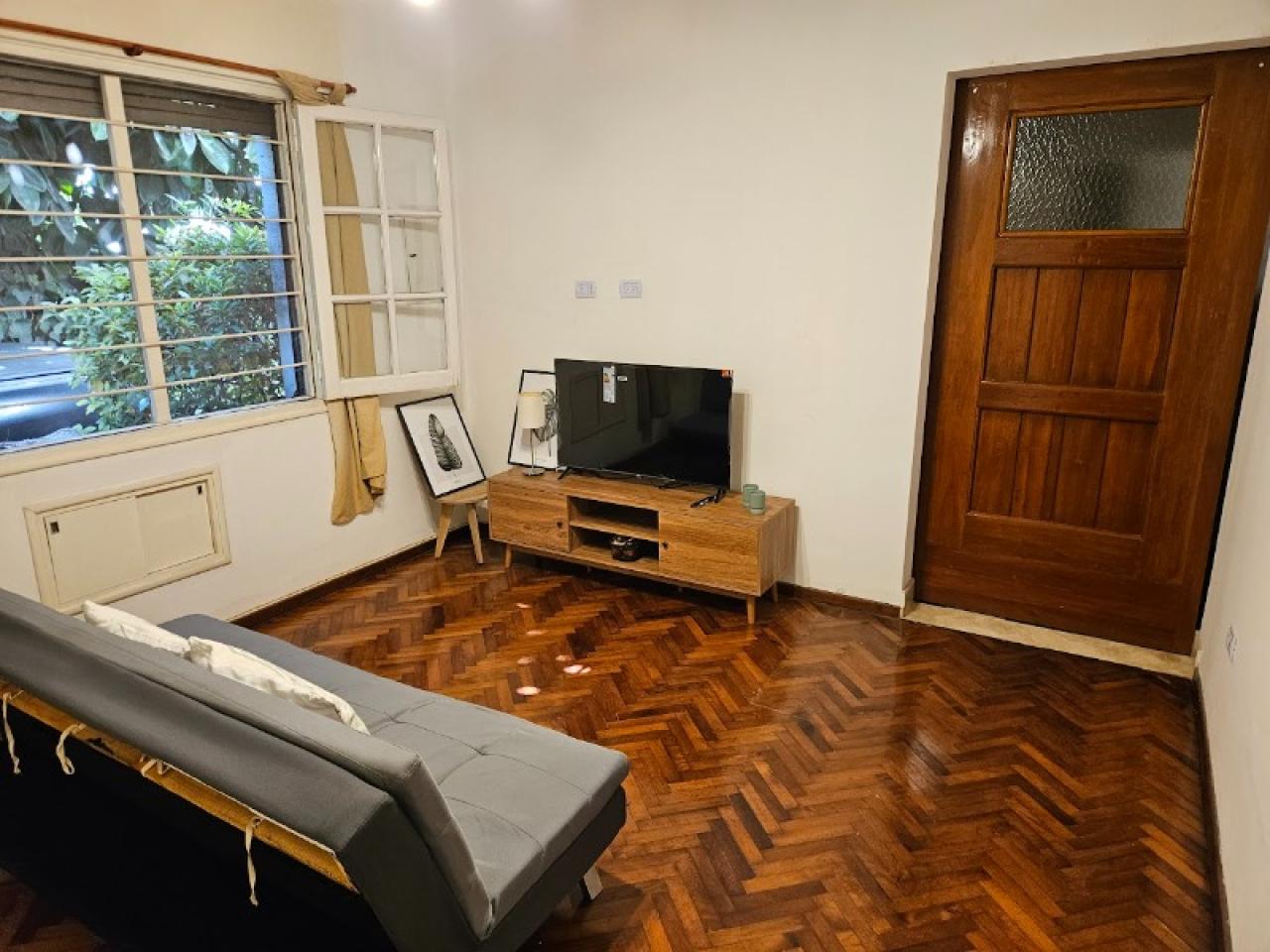 El departamento cuenta con 1 dormitorio con cama queen, aire acondicionado frío/calor y placard; estar con sillón (futón cama), Smart TV 43" y aire acondicionado frío/calor, cocina completa comedor separada con aire acondicionado, patio interno de 20m2, mas un enorme patio con muchísimo verde en zona común.
