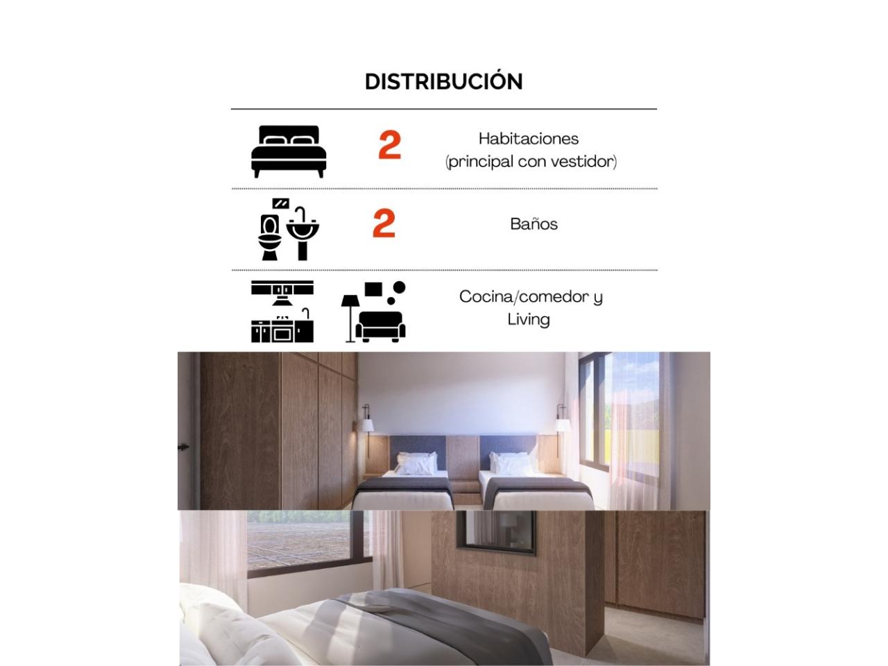 Planta alta, distribuida en dos habitaciones , principal con vestidor y segunda habitación amplia con placard y espacio pensado para dos camas de 1 plaza y media. El baño principal es compartimentado en tres, pensado para el uso simultaneo, sector ducha, vanitory y sector sanitarios..