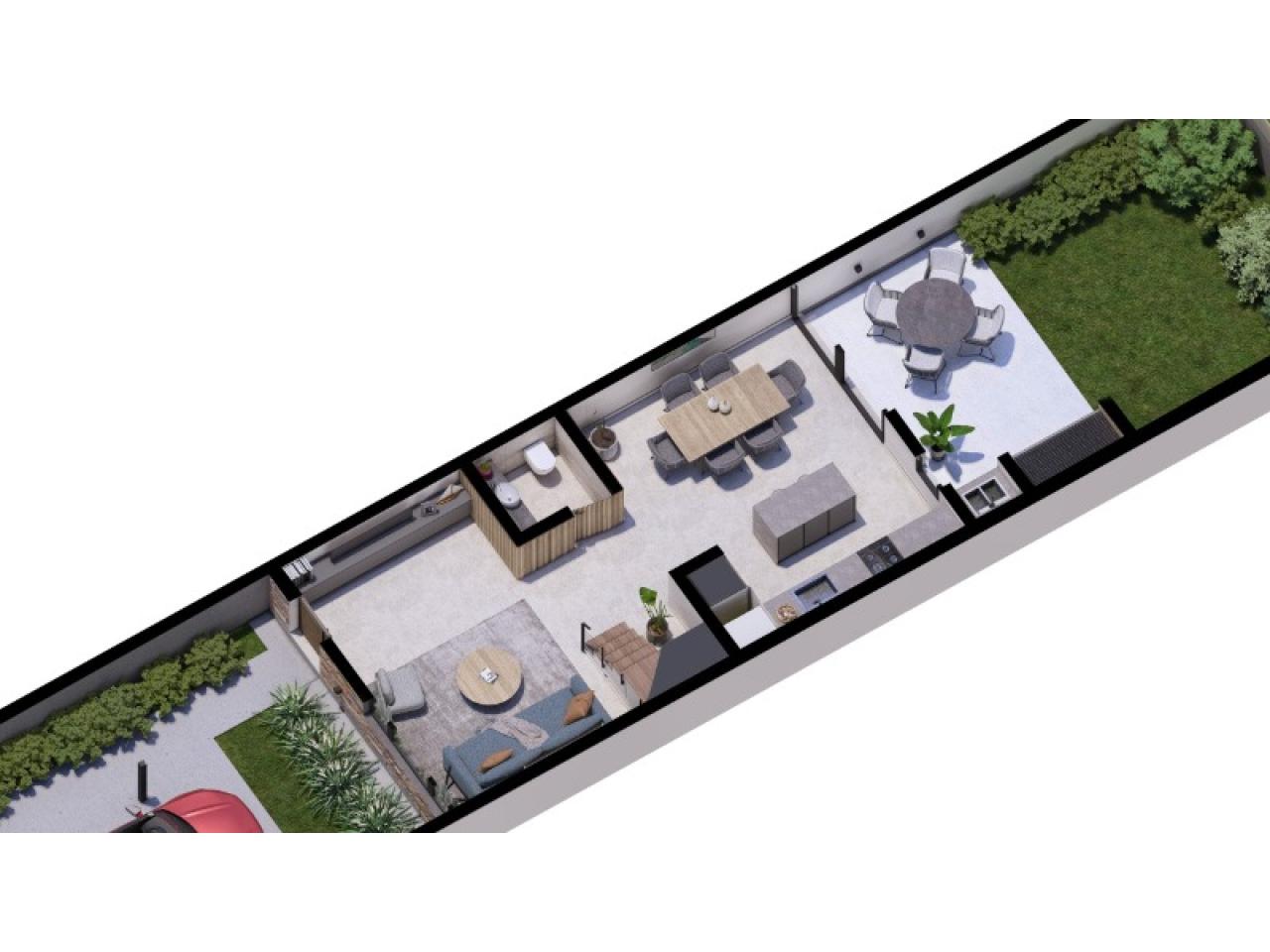 Planta baja, cocina/comedor integrados a galería y living, con baño .
