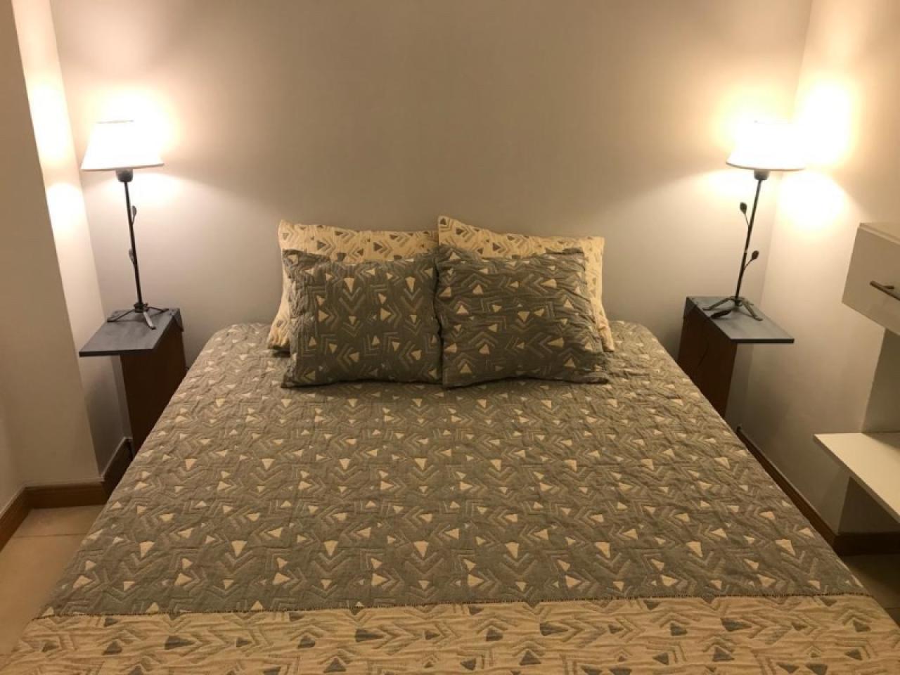 Departamento de dos ambientes en pleno centro de la capital de San Juan, ubicación estratégica equipado completo para 2 pax, con cocina, living comedor, desayunador, dormitorio cama matrimonial somier, baño, aire acondicionado frío calor, ubicado en edificio torres ELFE, primer piso, seguridad, SUM. Portero eléctrico