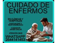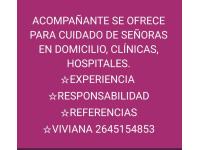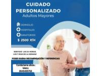Cuidado y/o acompañamiento de adultos mayores, enfermos o con incapacidad, control de signos vitales, administración de medicamentos, sonda vesical, curaciones , higiene y confort. En caso de guardia completa trabajamos en equipo con horarios rotativos para cubrir. Responsable,dedicada y con amplias referencias. Pagos diarios, semanales y presupuestos mensuales. Su consulta no molesta