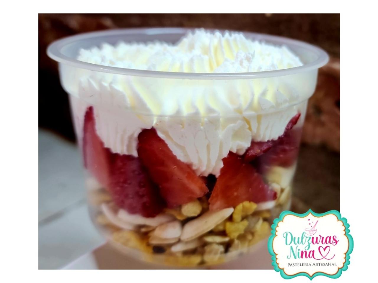 🌸 Shot con granola, frutillas y crema chantilly