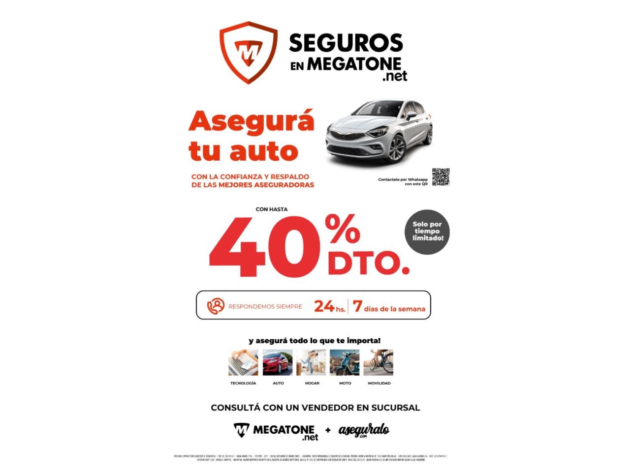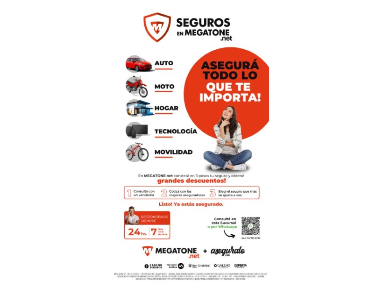 Aseguramos lo que mas queres con la confianza y respaldo de las mejores compañías ( SANCOR - GALENO - MERCANTIL - SAN CRISTOBAL) . ASEGURAMOS TU AUTO ,MOTO,HOGAR Y BICICLETA. ADEMAS POR CONTRATAR NUESTRO SERVICIO TE LLEVAS DE REGALO UN VOUCHER PARA CANJEAR EN LA SUCURSAL DE MEGATONE CAPITAL.