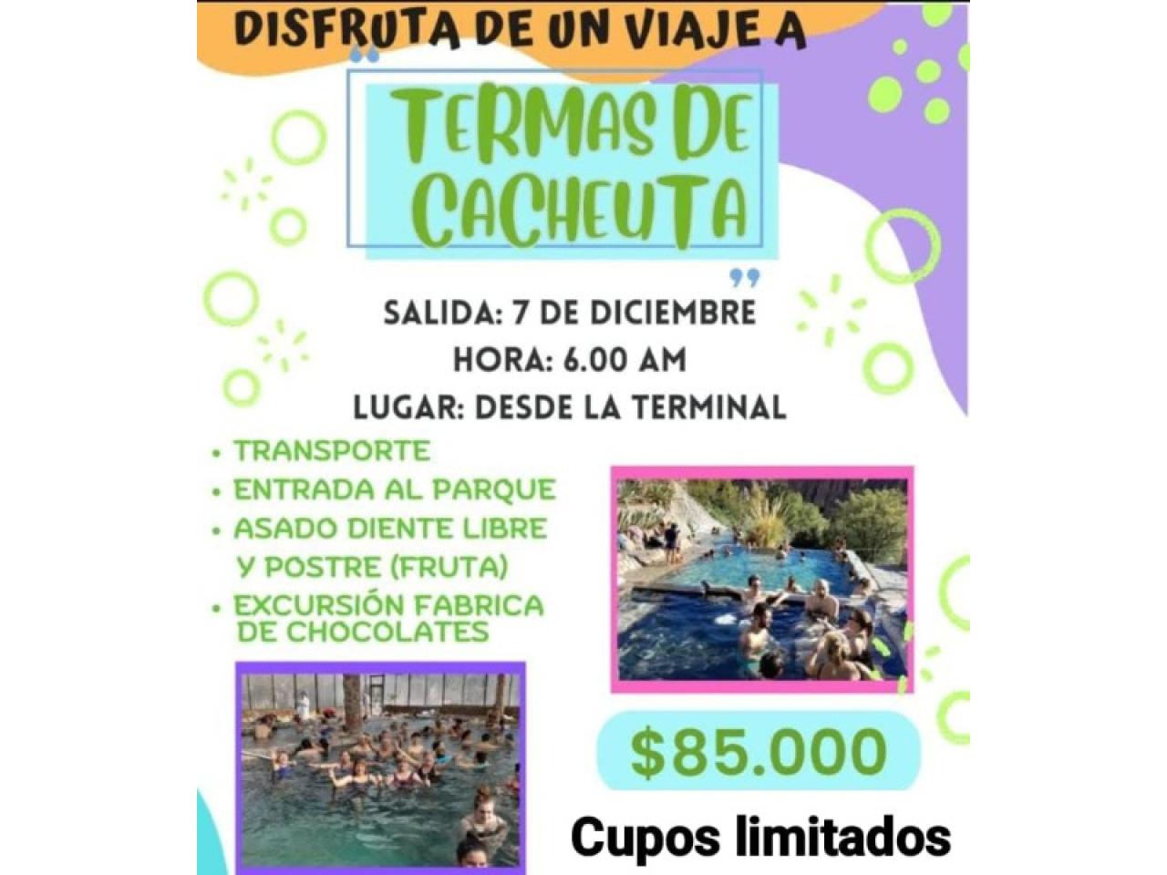 Disfruta un viaje a termas de cacheuta salida 7/12/25 de diciembre. Horas 6:00 AM de la mañana lugar desde la terminal.precios del pasaje por persona es de $85.000 número de teléfono del vendedor es franco tibani 2644141248