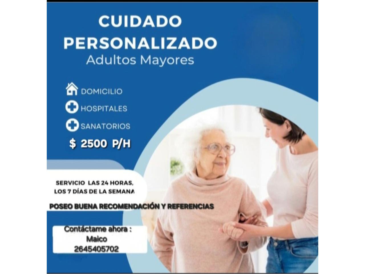 Cuido personas mayores, voy a domicilio,hospitales y sanatorios. El precio publicado es por hora. Poseo buenas recomendaciones y referencias..
