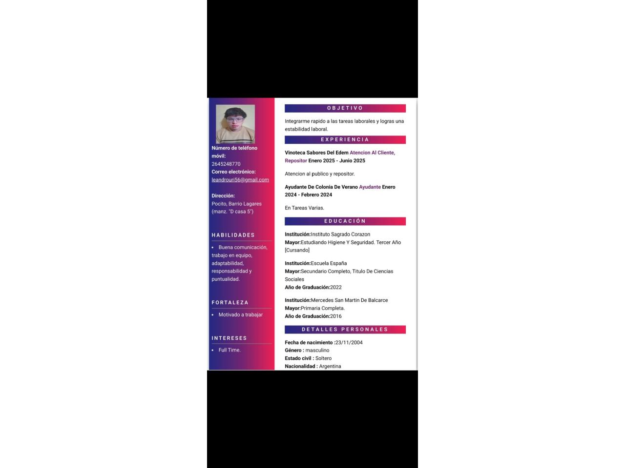 Busco trabajo full time. Soy una persona responsable, puntual y con muchas ganas de aprender. Me adapto rápido, tengo buen trato con la gente y compromiso con las tareas asignadas. Disponibilidad horaria inmediata.