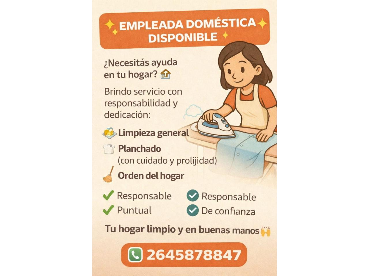 Busco trabajo como empleada doméstica o cuidado niños, tengo experiencia con bebés.