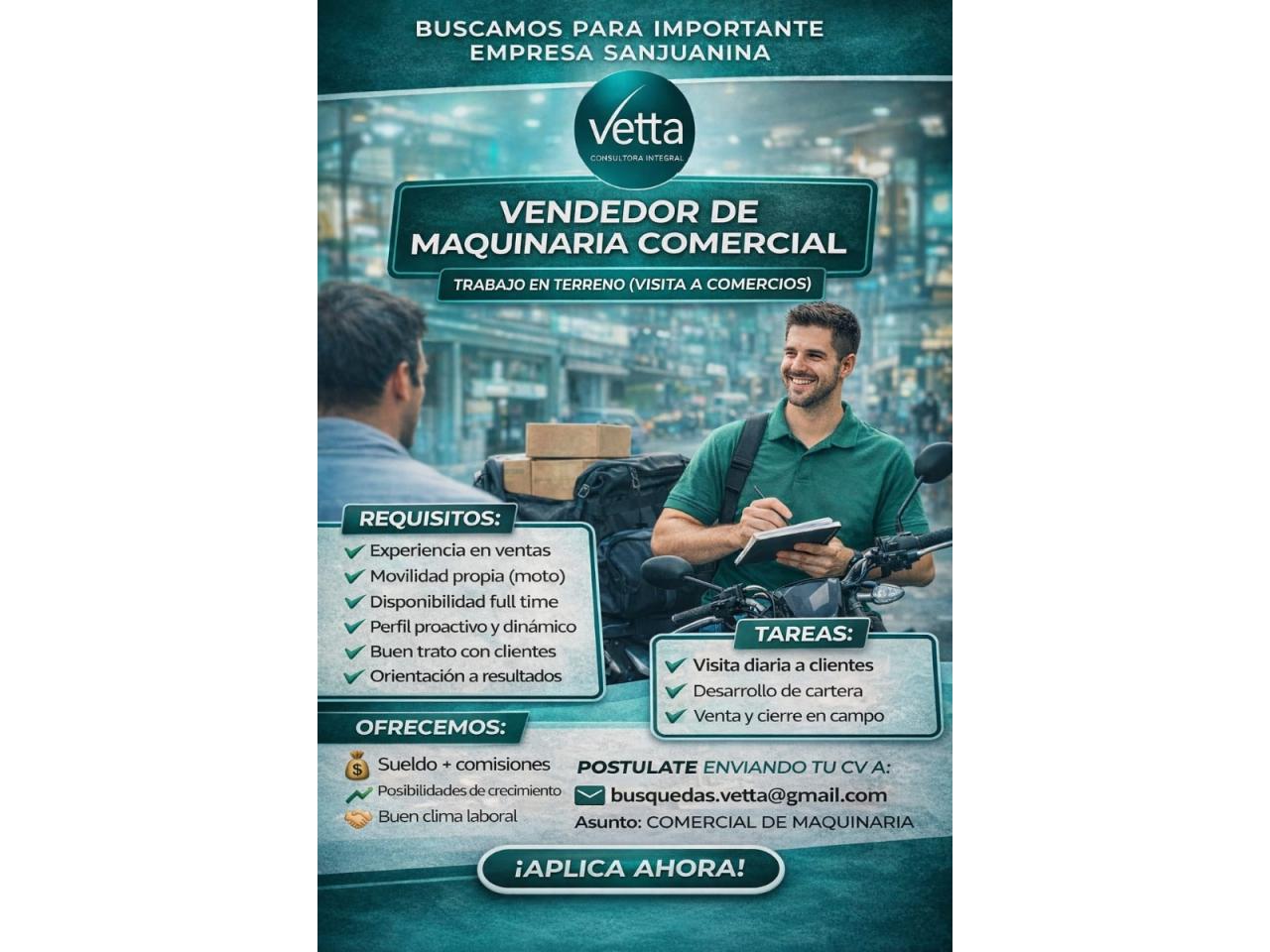 Buscamos Perfiles comerciales con disponibilidad full-time, con moto en condiciones, para trabajar en una empresa que vende maquinaria para comercios, zona capital. mandar cv a: busquedas.vetta@gmail.com con el asunto: COMERCIAL DE MAQUINARIA
