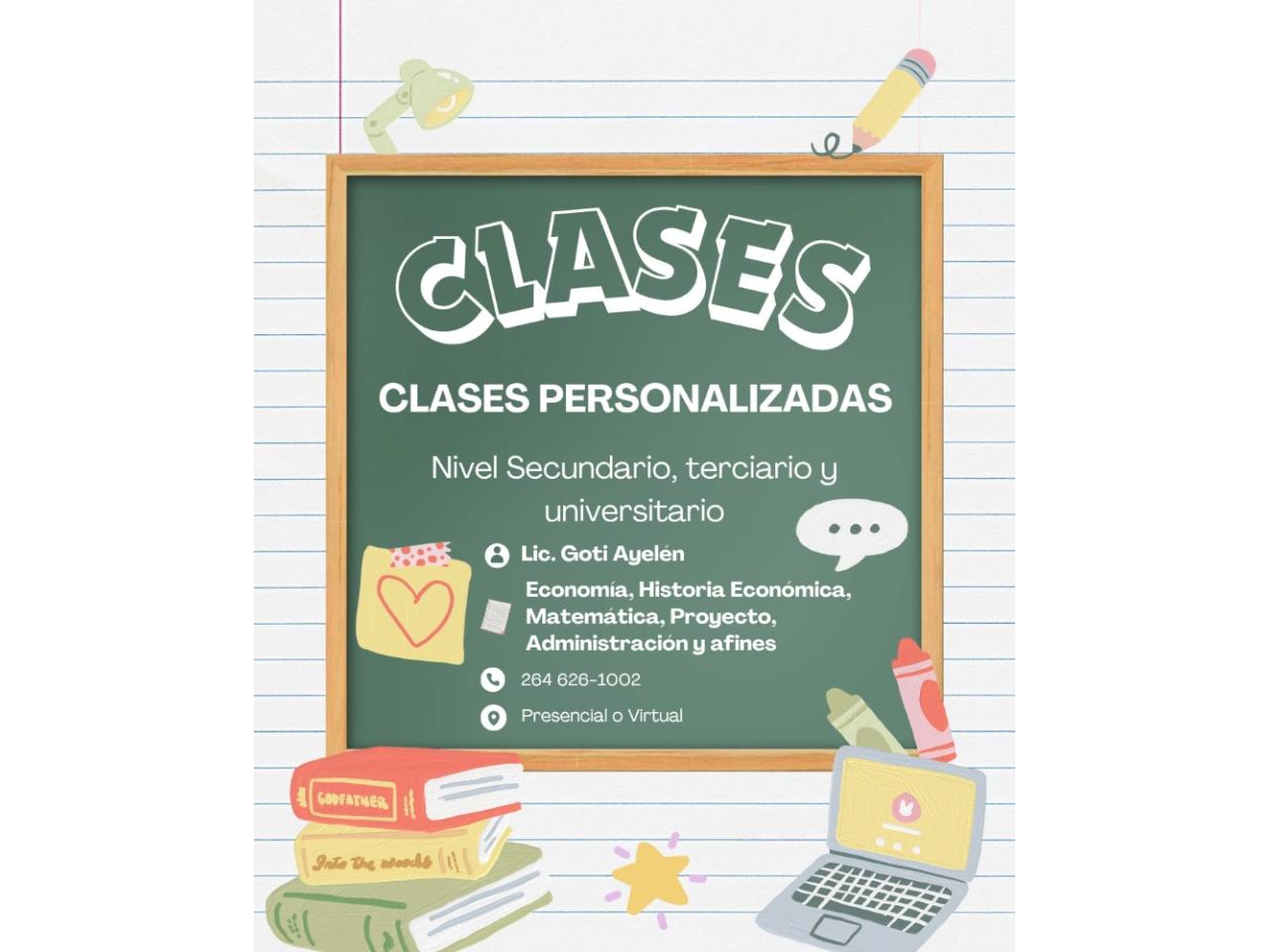 Clases personalizadas de nivel secundario, terciario y universitario. Pueden ser virtual o presencial.