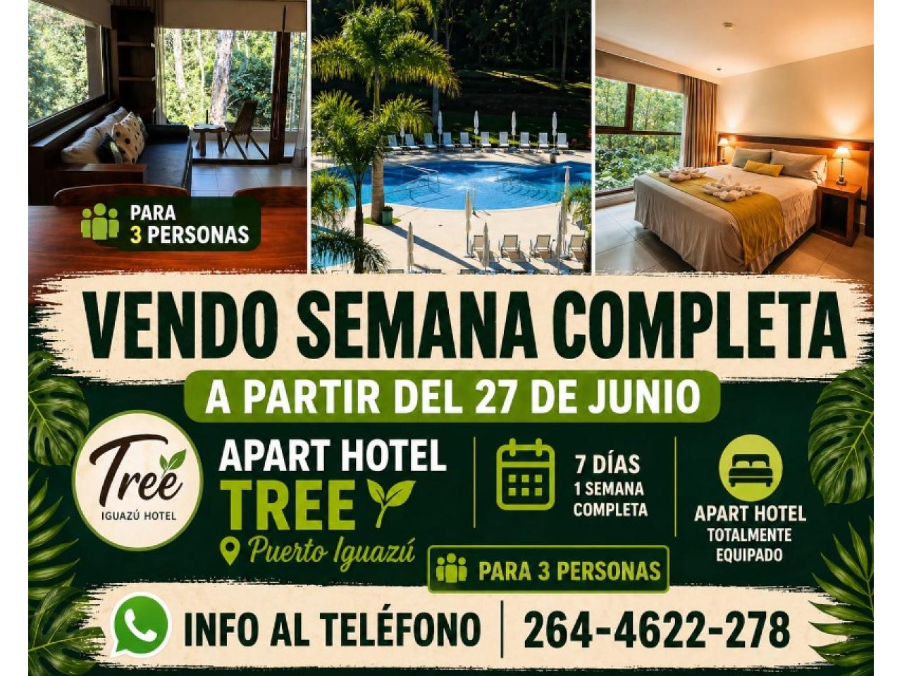 Vendo: 7 días en Apart hotel Tree, Puerto Iguazú, para 3 personas. Ingreso 27/06 al 04/07 . Info al 2644622278